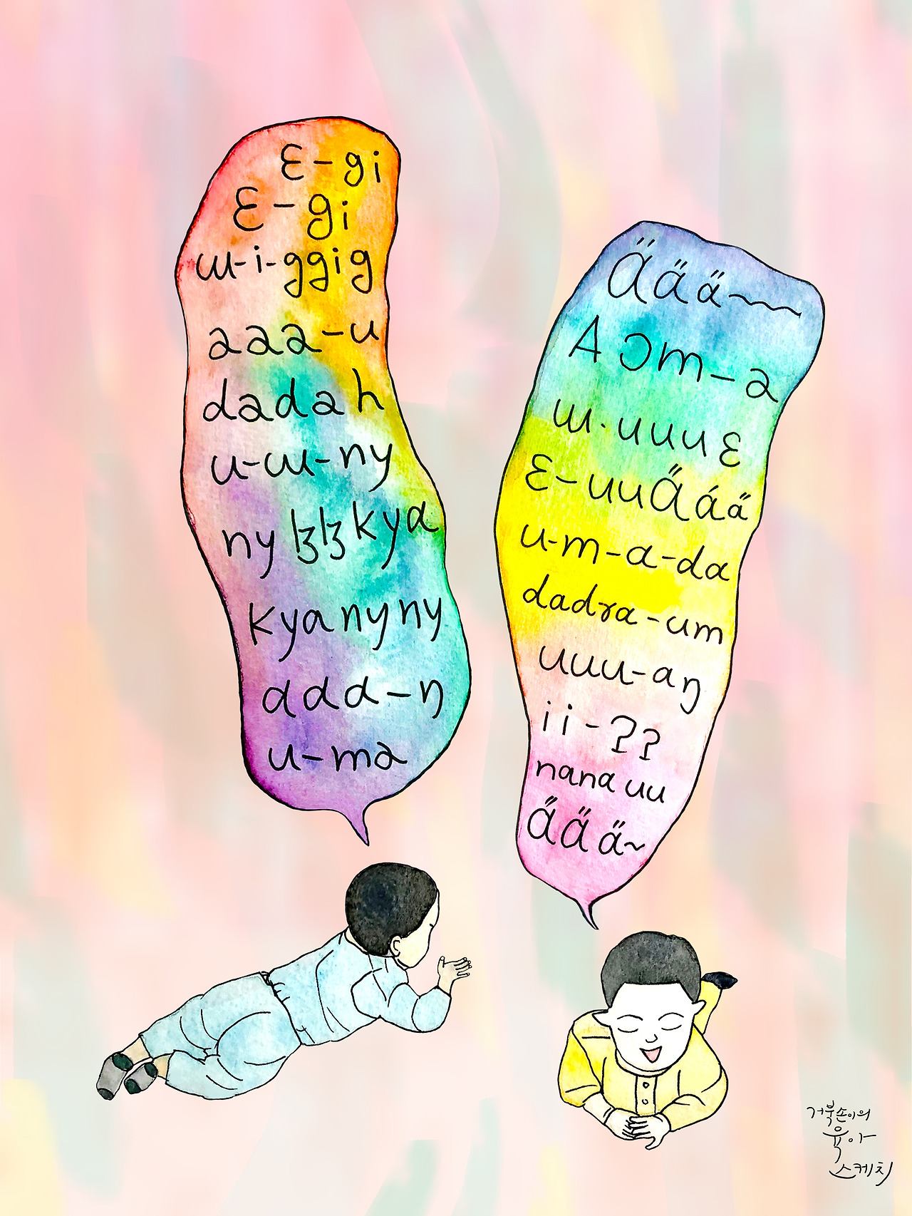 엄마가 대학 음성학 수업시간에 몇 번 봤던 국제 음성 기호를 정말 오랜만에 꺼내봤단다. 너희의 옹알이를 표현하려면 이 방법밖에 없겠다 싶었어. 귀를 기울여 너희가 내는 소리를 받아 적어봤지. 생후 8개월. 우현이는 자음을 더 많이 쓰고 다현이는 모음의 높낮이를 잘 조절하더라. 무슨 뜻인지 모르겠지만 귀엽고 즐거워 보여. 너희 목소리가 엄마에겐 무지개야. 신비롭고 아름답단다. 아빠는 10달 만에 말을 했대. 엄마도 말은 빨랐다는구나. 천천히 말해도 상관없지만 너희가 종알종알하는 예쁜 모습 어서 보고 싶어. 엄마도 말 깨나 많이 하지만 너희가 얘기할 땐 늘 귀 기울여줄게. 뭐든지 엄마한테 얘기하고 나면 마음이 편안해질 거야.