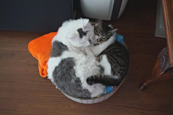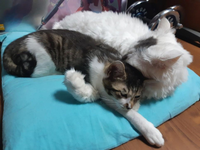 막내 냥이가 집에 들어오자마자 코로나 사태가 심각해지고 울 집 두 남매가 가정 학습을 시작한 바람에 이 녀석은 정말 몇 달 동안 지극정성으로 가족들의 보살핌을 받았습니다. 먼저 집에 있던 첫째 냥이와의 합사도 생각보단 수월했어요. 가장 합사가 어렵다는 수컷 두 마리였지만 나이 차, 덩치 차이가 이미 꽤 나는 데다 첫째 냥이가 비교적 쉽게 이 어린 녀석을 품어 줬습니다. 일주일도 되지 않아 함께 붙어 밥 먹고 자기 시작했으니까요. 오히려 순한 편인 첫째냥보다 이 작은 녀석이 길냥이 특유의 파이터 기질이 있어서 싸움을 뜯어말려야 했어요.