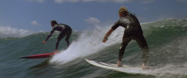 물론 지금의 관점으로 냉정히 들여다본다면 두 주인공이 서로에게 유대감을 나누는 과정에서의 드라마가 좀 헐겁게 느껴지기도 해요. 익스트림 스포츠를 매개로 한 두 남자의 샤방한 브로맨스를 떼놓고 본다면, 결국 각자의 영역에서 제대로 동화되지 못했던 '부적응자'들의 안타까운 일탈기일수도 있습니다. 본분을 심각하게 망각한 FBI 수사관과, 스스로를 마치 '의적' 인양 착각하고 있는 바닷가 양아치가 각자의 동료들에게 치명적 민폐를 안기는 스토리로 바라볼 수도 있으니까요. 두 주인공 캐릭터가 이렇듯 확실한 선과 악의 경계로 나뉘지 않는다는 점도 당시로선 꽤 이례적이었죠. 하지만 영화는, 두 주인공의 그 정체성 고민(?)을 그리 심각하고 무겁게 끌어가진 않습니다. 그 선에서 그렇게 적당히 뭉뚱그려 흐릿하게 만들어버린 게 오히려 이 작품의 미덕이자 매력으로 보이죠.