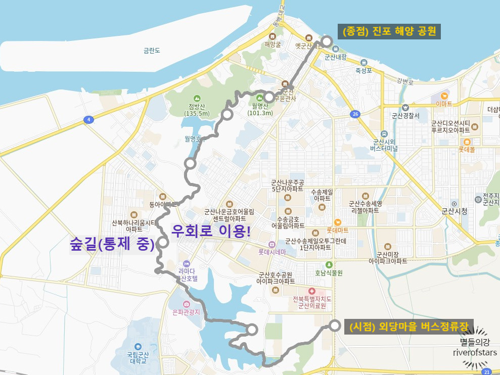 5월 11일 토요일, 서해랑길 지킴이 두 번째 활동날이다. 화창하던 하늘이 어둑어둑해지더니 저녁무렵에는 비까지 내렸다. 이번 활동은 서해랑길 54코스에서 정방향(외동마을 버스정류장 → 진포해양공원)으로 진행했다. 걸으며 안내사인(리본/화살표)을 정비하고, 길에 이상은 없는지 점검한다. 길의 안전성과 편의성, 쾌적성을 정기적으로 살피는 것이 지킴이의 일이다.