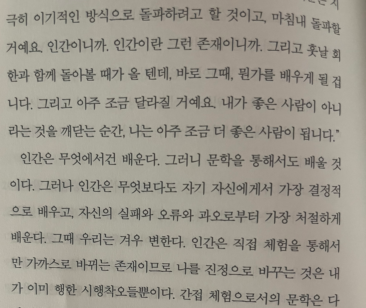 나는 그것이 고통을 자기 연민으로 소모해 버리기 때문이라고 생각한다. 사건을 사유하는 과정에서 작은 타당성 하나라도 붙잡으면, 그 안도감에 기대어 멈춰 버린다. 그래서 결국 “사람은 안 변한다"라는 체념만 남는다.