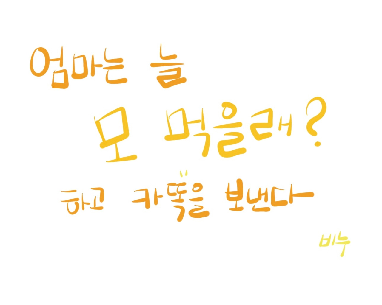 엄마는 늘 '모 먹을래'하고 카톡을 보낸다. 대부분의 부모님들이 자식에게 가지는 최대 관심사 일지도 모른다. 뭐가 먹고 싶은지, 밥은 잘 챙겨 먹고 다니는지. 처음에는 생각나는대로, 떡볶이 해줘, 부침개 해줘 등 어릴 적부터 엄마가 간식으로 해주던 것들을 주문했다. 그러면 엄마는 큰 일이라도 치르는 것처럼 해달라는 음식을 해준다. 내가 한 입 챙겨 먹는 것을 보고서야 본인 할 일을 하러 쿨~ 하게 자리를 떠난다. 나의 엄마는 가난한 젊은 시절을 보내서 그런지, 항상 먹는 것이 제일 중요한 문제였다. 잘 챙겨 먹어야 하고 또 굶거나 끼니를 거르지 말아야 한다. 그래서 어릴 적 빠듯한 살림에도 늘 식탁은 넉넉했고, 간식까지 항상 준비되어 있었다. 지금도 엄마는 베란다를 창고 삼아 이제는 먹을 사람도 별로 없는데, 인스턴트 식품이나 오래 두어도 되는 재료들을 담아둔다. 그로인해 종종 좀 치우자는 나와 다투기도 하지만, 어느 때 문득 감자 한 알이 필요해서 사와야하 하나 싶을 때, 싹이 나서 상할까봐 예쁘게 깍아 물에 담가 보관하고 있는 엄마의 감자 한 알이 보석처럼 튀어나온다. 그럴 때면 엄마의 어깨도 으쓱해진다. 다 필요한 거다, 상하지 않는 건 미리 사두는 거다, 가지고 있으면 다 쓸데가 있다. 되도록 버리고, 가볍게 살고 싶은 나는 아직도 엄마의 보물 창고에 기대어 산다. 엄마 집에 오징어 없지? 부추 넣고 전 부쳐먹고 싶다. 있지 왜 없어. 냉동실 가득 동그랗게 동그랗게 얼어있는 비닐 봉지 무더기 속에서 우당탕 얼린 오징어를 찾아낸 엄마는, 냉장실 야채 칸의 부추와 양파 마저도 산삼을 캐듯 의기양양하게 꺼내 전을 부친다. 엄마표 전 냄새가 꼬소하게 거실에 풍겨오면, 건재함을 선언하듯 엄마가 말한다. 다 했어, 와서 먹어~