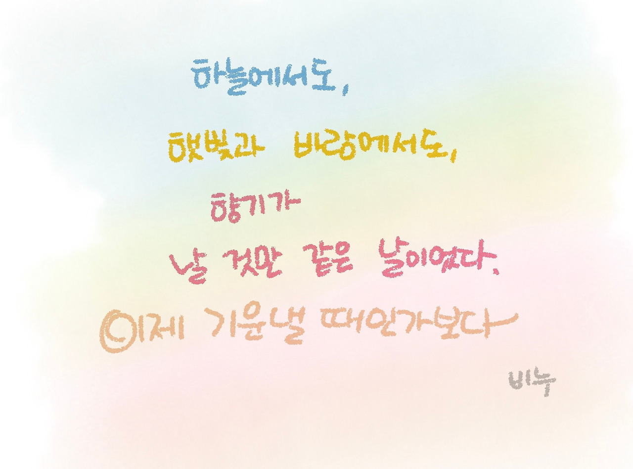 이 모든 게 하루, 반나절도 안 되는 시간 동안 일어난 일이다. 그리고 그날은 날씨가 참 좋았다. 하늘이 맑고 바람이 선선했다. 하늘에서도, 햇빛과 바람에서도 향기가 날 것만 같은 날이었다. 이제 기운을 낼 때인가보다. 이렇게 따뜻하기만 한 하루를 보내는 것을 보니.