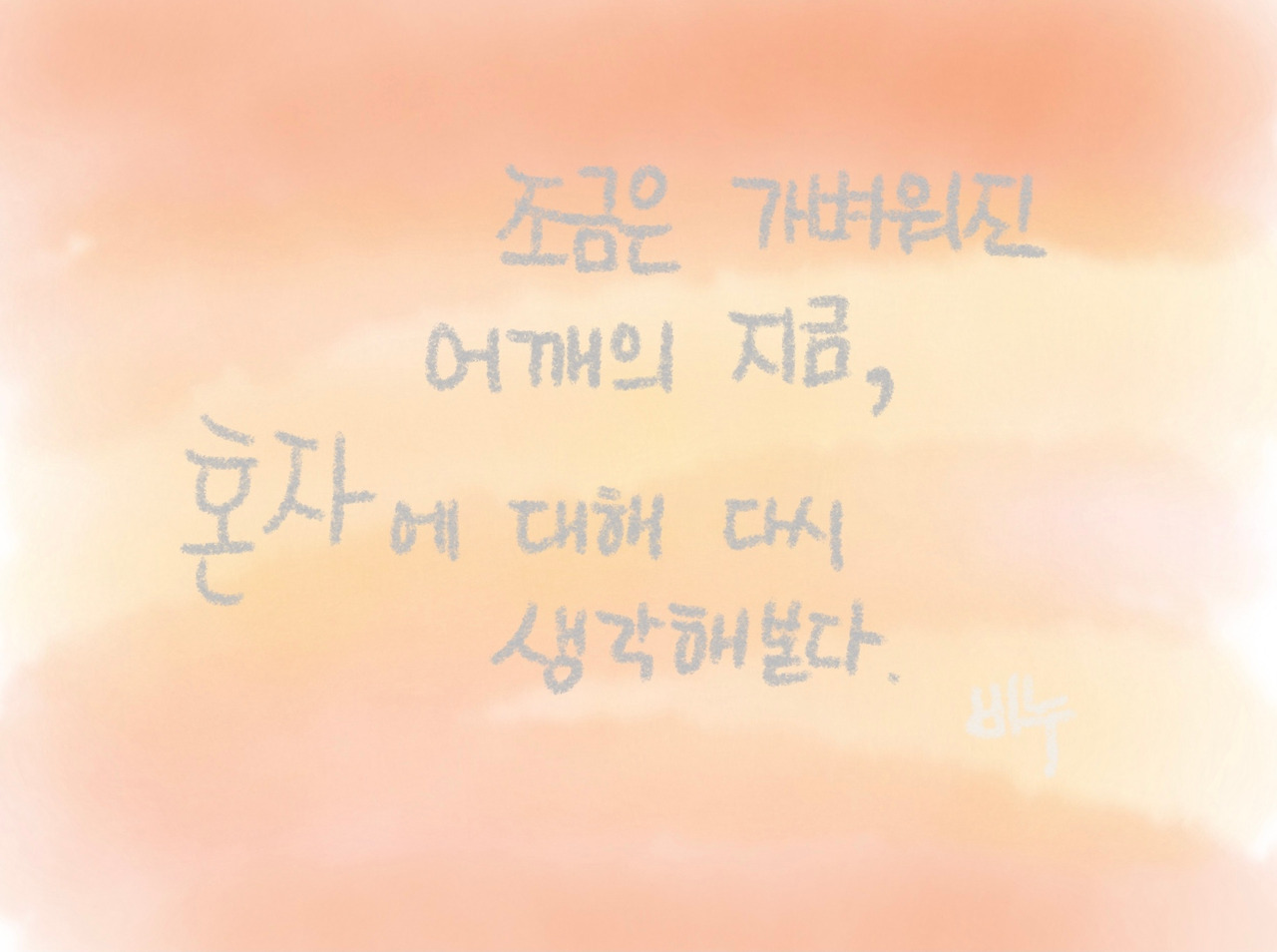 대략 한 달 조금 더 전부터 나는 꼭 하루치 힘듦을 떠안고 있었다. 하루치씩 힘듦과 버거움이 차곡차곡 쌓여갔고. 어느 날은 그 무게에 눌려 주저 앉아 울기도 하고, 또 어느 날은 조금 힘을 내 버티기도 했다. 울어도 괜찮고, 버텨도 괜찮다. 하루는 지나가고 쌓인 것도 흐스스 옅어져 갔다. 그리고 조금은 가벼워진 어깨의 지금. 혼자에 대해 다시 생각해본다.