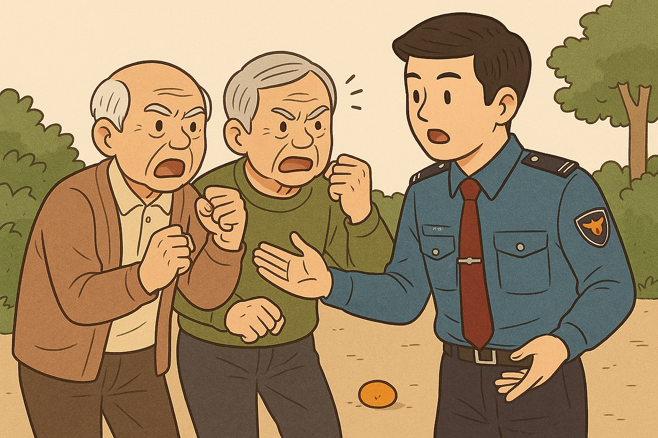 두 할아버지는 옥신각신하며, 한쪽에서는 ‘절도죄’로 사건접수를 원하였고, 다른 한쪽은 ‘무고죄’로 덩달아 접수하겠다고 소리를 질렀다. 이제는 정확한 용어도 알고 계셨다.