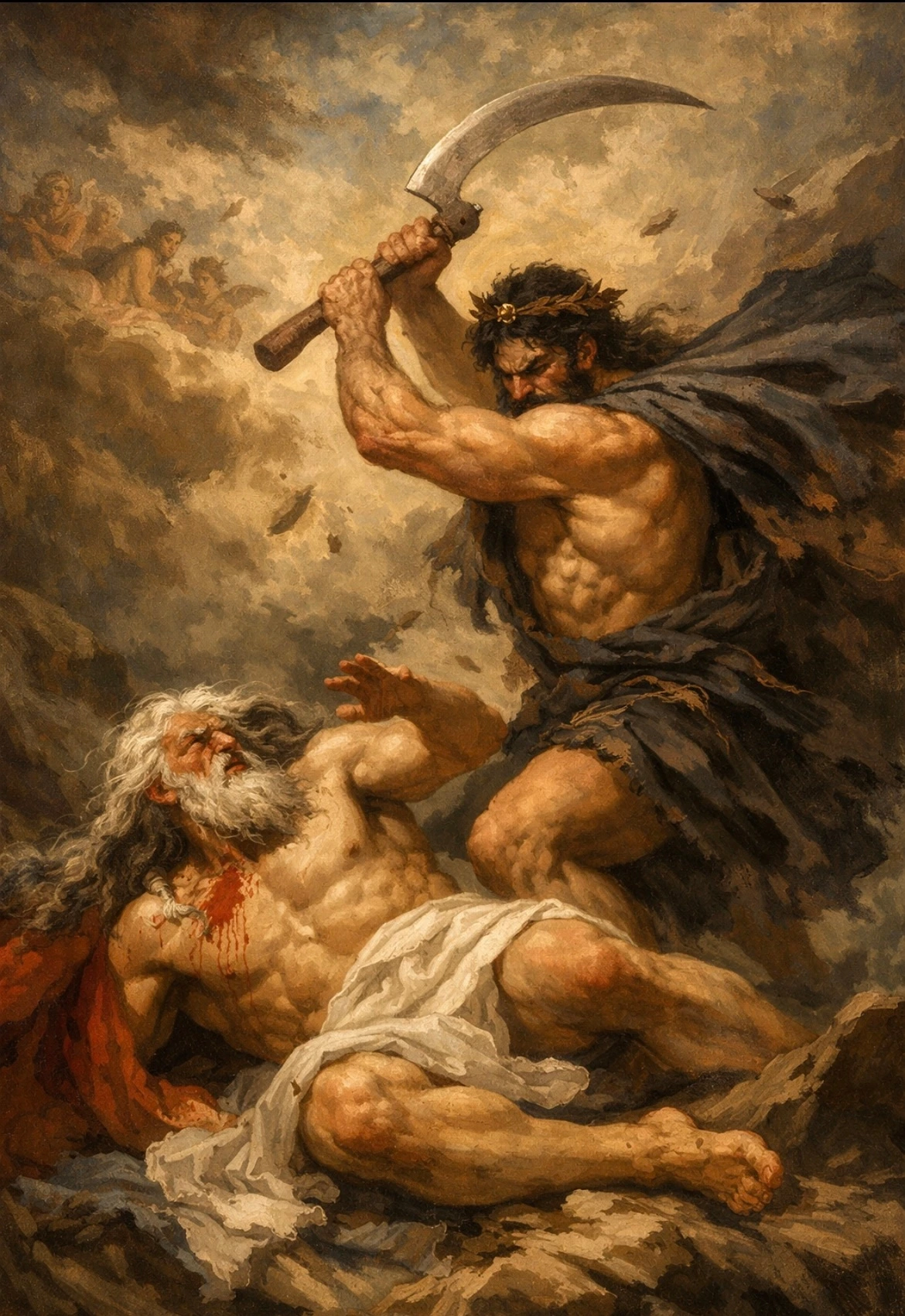 이에 분노한 가이아는 다른 아들들에게 아버지를 내쫓을 것을 명한다. 하지만 이에 모두 겁을 먹는데 오직 막내아들만이 잠을 자는 아버지를 습격해 쫓아버린다.