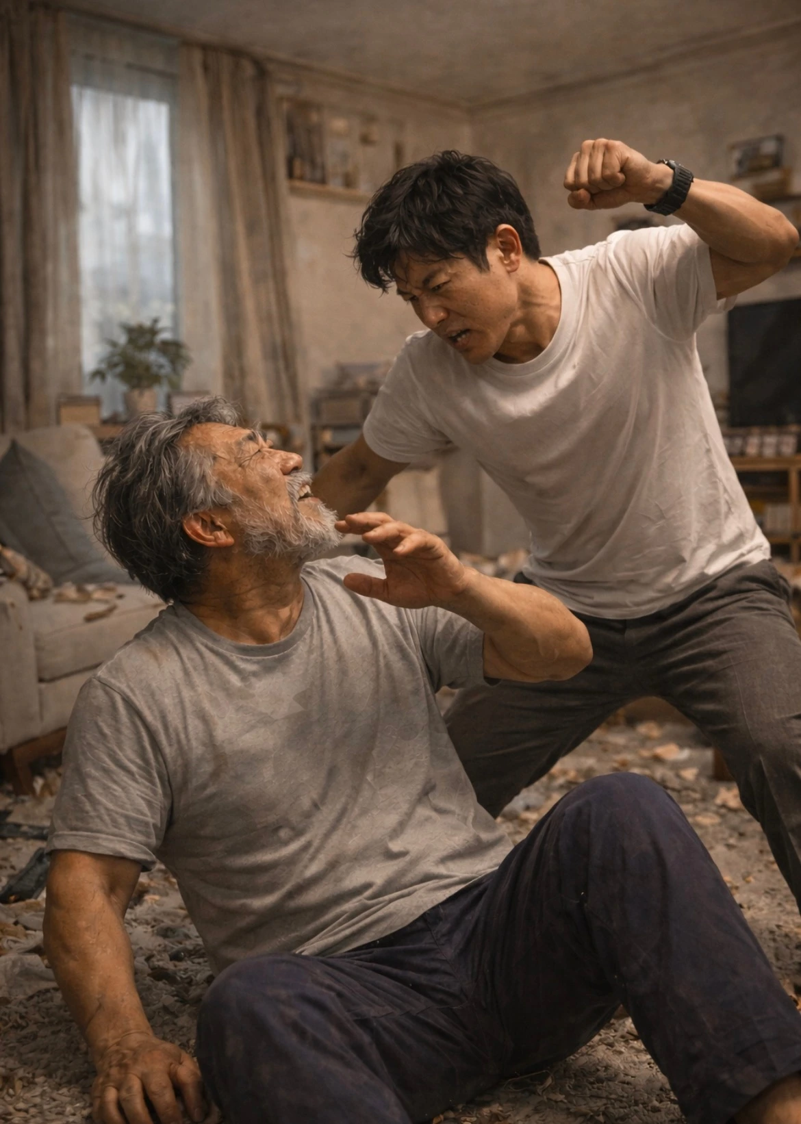 우리가 어찌나 흥분한 상태로 고래고래 소리를 질렀는지 멈추지 않을 것 같았던 두 사내도 잠시 멈칫하였다. 그리고 우리는 이 틈을 놓치지 않고 나는 아들을, 홍경장님은 아버님 쪽을 맡아 각자 다른 방으로 밀어 넣고 문을 닫았다.