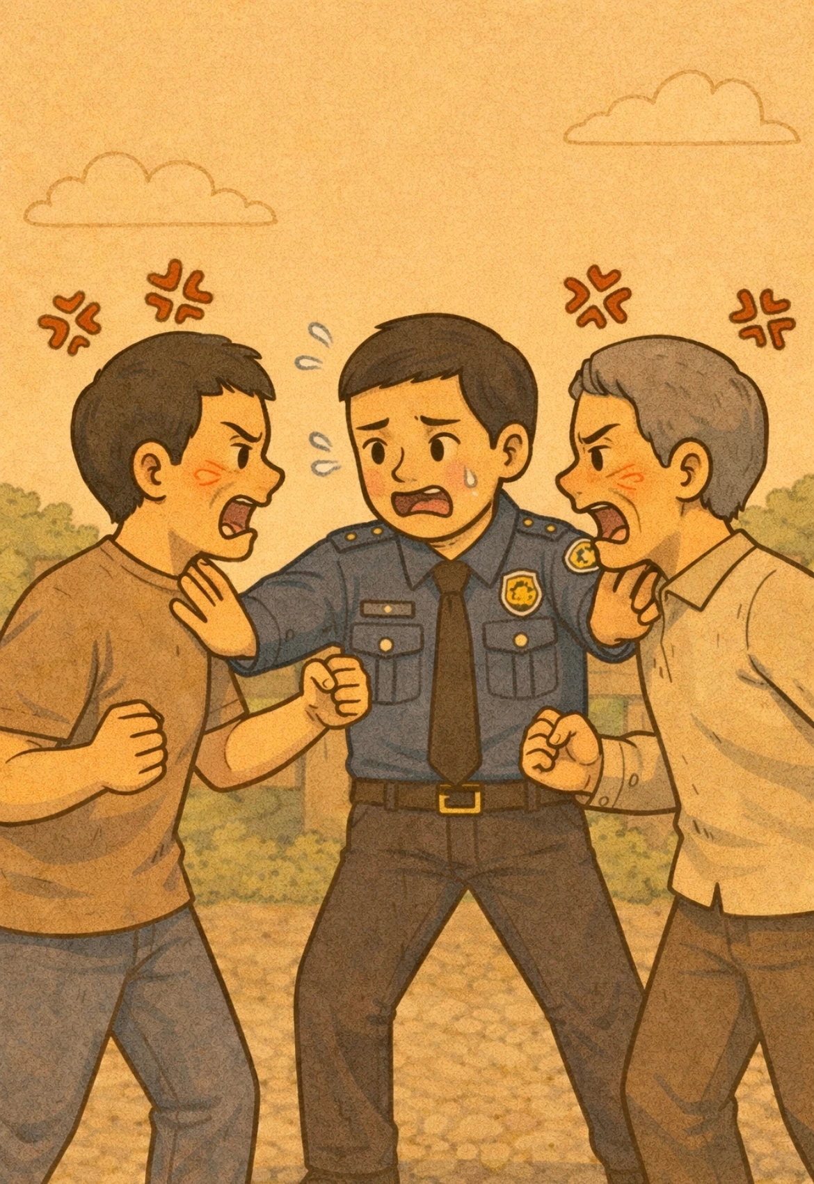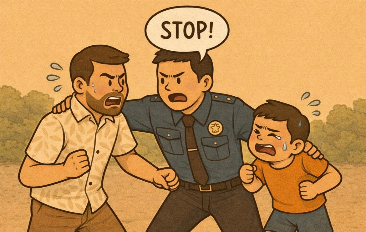 “아들분. 진정하세요. 존속폭행은 가중처벌 대상입니다. 더군다나 아무리 그래도 아버님을 상대로 맞짱이라니요. 여기서 한 번만 더 서로 싸우시면 그 순간 체포합니다.”