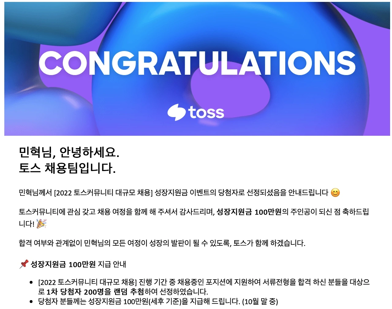 사실 정말 운이 좋았던 것은, 토스에서 진행한 이벤트에 당첨이 되어 성장 지원금 100만 원을 받았다는 것이다.