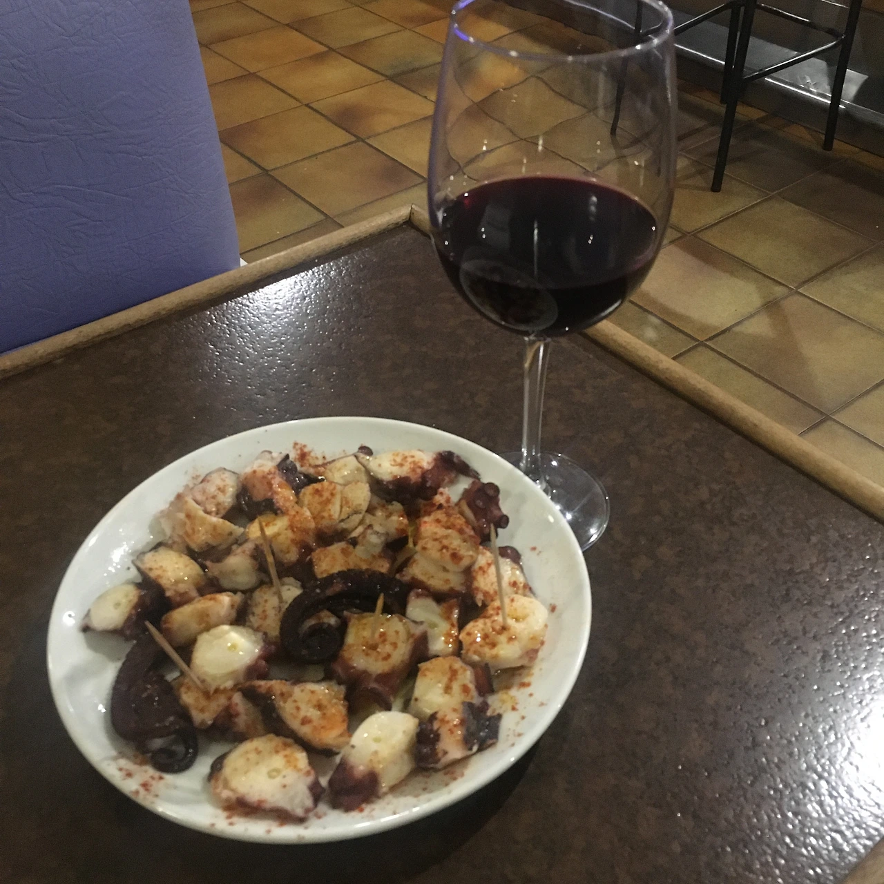 약기운에 어른거리던 졸음이 번뜩 스쳐가고 눈을 뜨니 아직 사람들이 어수선한 것이 늦은 저녁은 아니겠구나, 아, 이곳은 Polvo(문어를 부드럽게 삶은 후 얇게 썰어 감자 위에 올리고 올리브 오일, 굵은소금, 파프리카 가루를 뿌려 만든다)가 유명한 곳이라는데, 그걸 먹어야 되는데, 그 일념 하나로 침대에서 몸을 일으켜 식당으로 나왔다. 든든히 먹은 저녁 덕분에 배도 별로 고프지 않았지만 갈리시아 지방에서 유명하다는 제대로 된 Polvo 요리를 먹어보고 싶었다. 순례자의 주머니 사정엔 어울리지 않는 12€의 거금이었지만 감기 기운에 투둑 하니 걸쳐있는 찌뿌둥한 기운을 날려보고도 싶었고 스페인에서 할 수 있는 몸보신으로 화끈하게 몸을 데우고도 싶었다. 와인과 함께 마시며 의도대로 따듯하게 달궈진 손바닥으로 오랫동안 일기를 적었다.