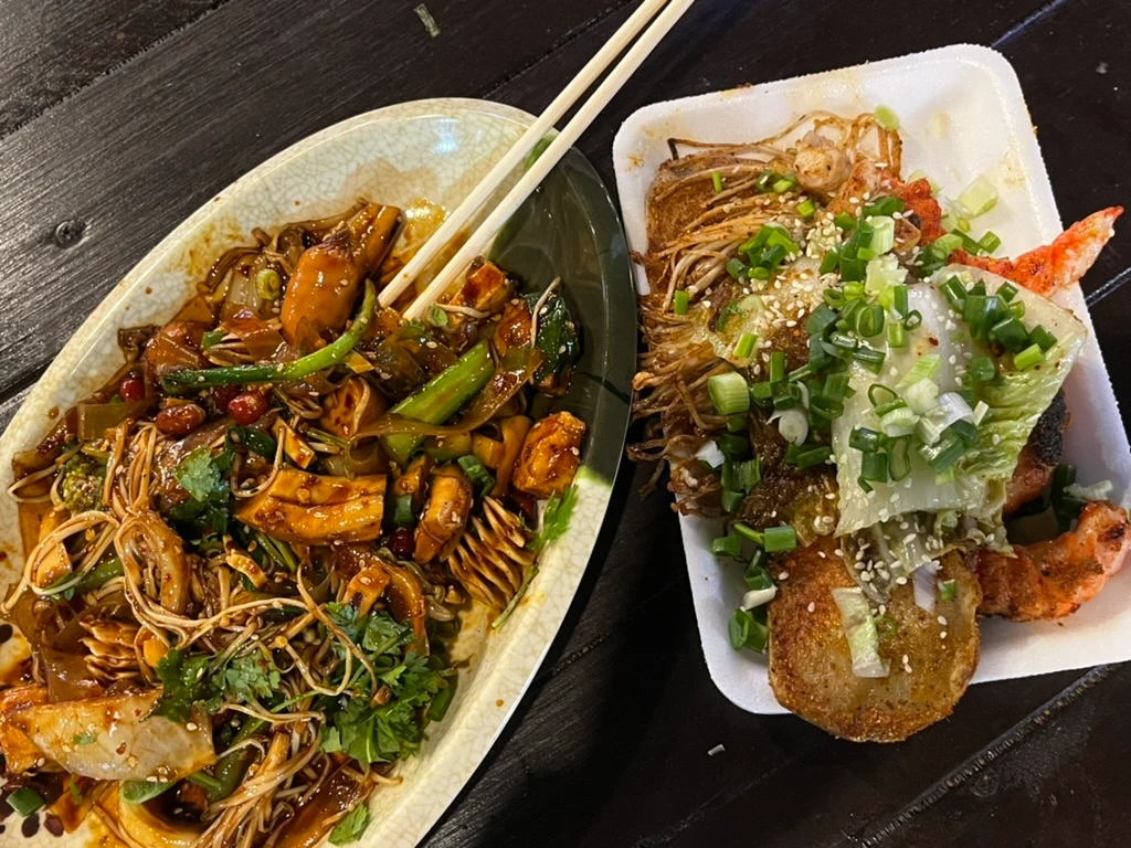 앞으로 매일 밤마다 열릴 야시장에 미련을 가질 필요는 없다. 요기나 할 겸 먹자 광장으로 들어서자 치이는 게 한국사람이다. 종로 광장시장인지 루앙프라방인지 잠시 헷갈렸으나 먹거리를 찾아 사고는 자리를 맡았다. 중국 샐러드로 팔고 있는 무침은 마라 샹궈와 비슷했고, 꽤 짜고 맵긴 했지만 그런대로 맥주 안주로 제격이었다. (맛이 없는 게 없는 나니까 당연하다.)