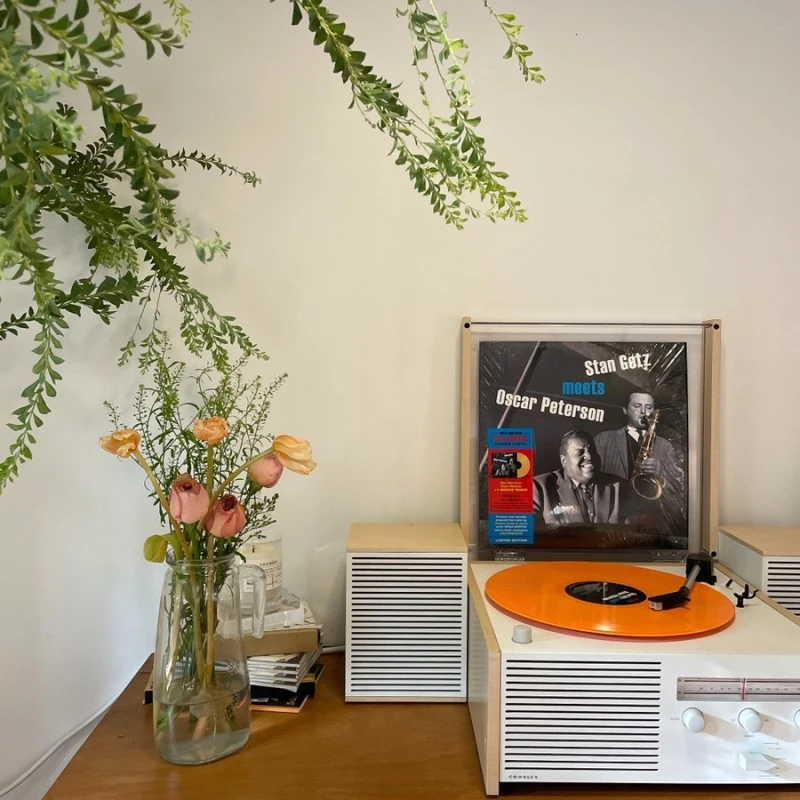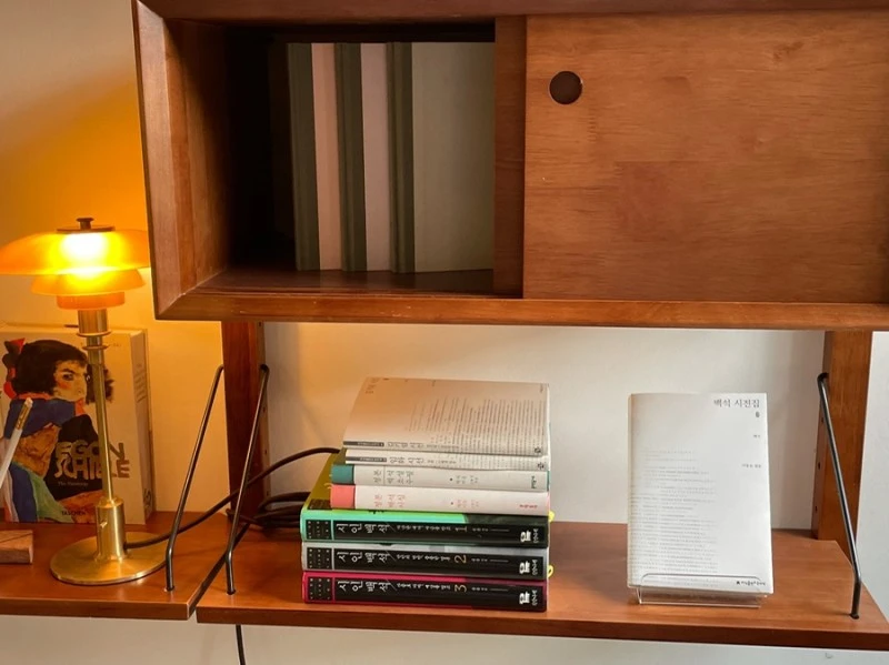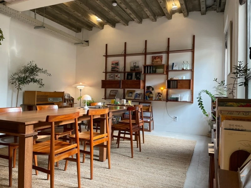 공간에 한쪽 벽을 차지라고 있는 나무색 책장은 따스한 분위기를 자아낸다. LP 박스, 테이블 역시 원래 이 건물에 있던 마냥 이질감이 느껴지지 않는다.