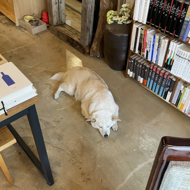 제주 풀무질 곳곳을 둘러보면 책방 지기님의 취향과 손길을 발견할 수 있다. 손으로 꾹꾹 눌러쓴 추천 책 100선이 붙어있는 벽면, 책방 한구석 마련된 서울 풀무질과 사장님의 옛이야기가 담긴 섹션, 중간중간 편하게 앉아 책을 읽을 수 있는 자리도 눈에 띄었고, 또 다른 책방 지기이자 은 사장님의 아내분이 손수 만든 책갈피도 만날 수 있었다. 해가 드는 위치에서 곤히 낮잠을 자다가 사장님이 밖으로 나가자 쪼르르 달려가서 지켜보는 귀여운 반려견 광복이도 이 서점에서 놓칠 수 없는 포인트이다.