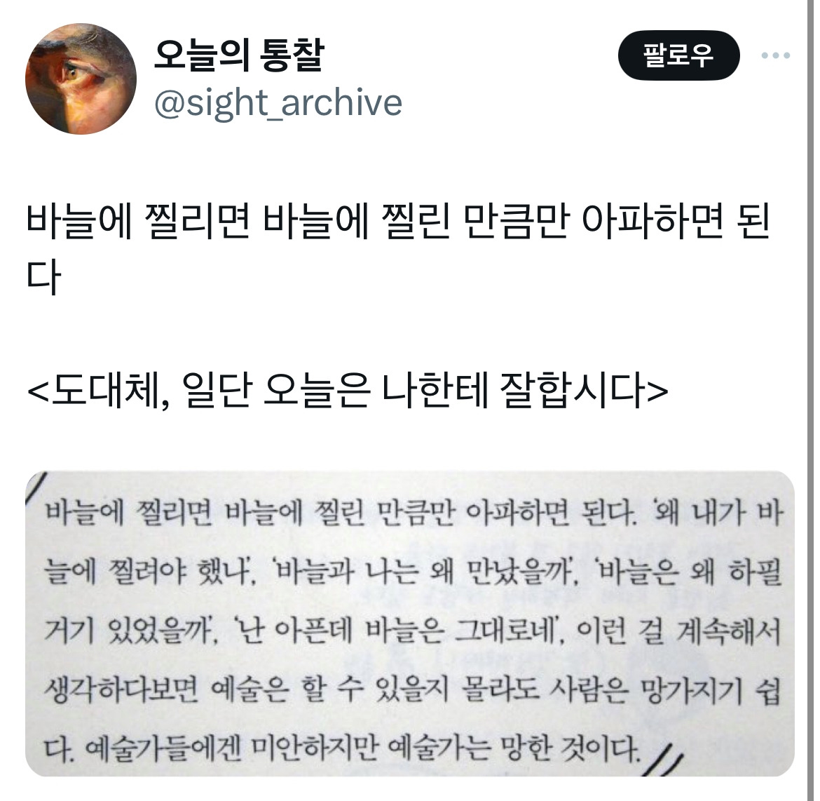 이 말도 기억해 둬야지…… 할머니가 내 욕을 하면 그만큼만 아파하면 된다. 왜 내 욕을 하시지? 할머니랑 나는 왜 같이 살지? 할머니께선 왜 하필 내 방문 앞에서 욕을 하셨을까. 난 아픈데 할머니는 웃고 계시네. 이런 걸 계속해서 생각하다 보면 브런치는 쓸 수 있어도 사람은 망가지기 쉽다. 브런치 딱 닫으면 생각 딱 그만해야지.