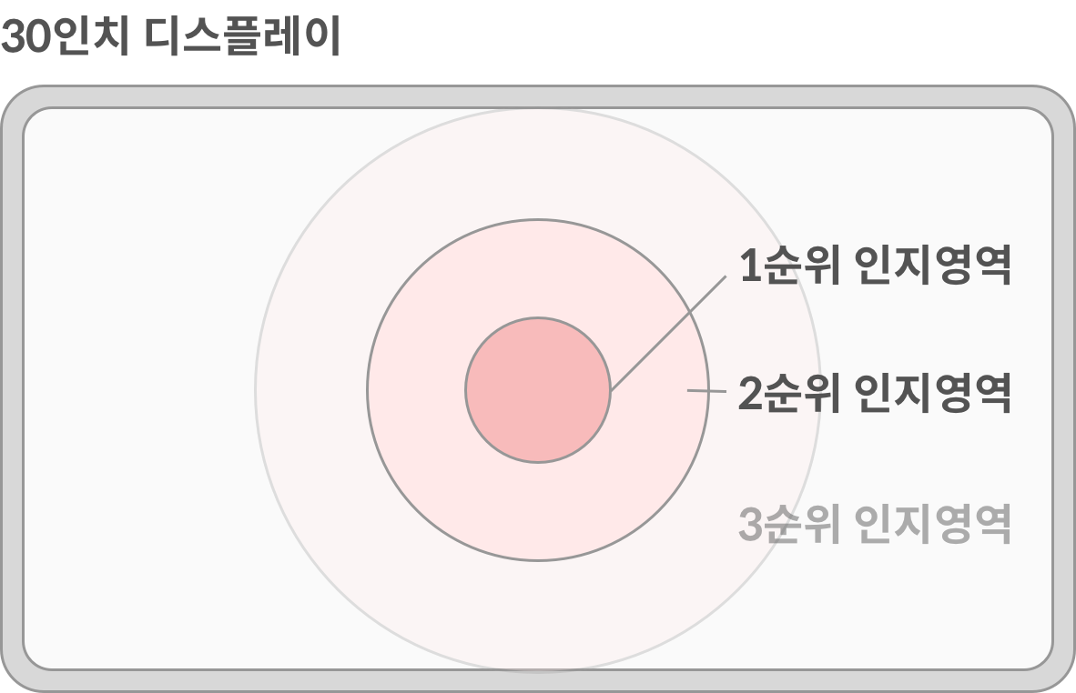 일반적으로 키오스크 앞에 선 사람의 눈과 디스플레이의 간격은 50~70cm 내외입니다. 이때 손 끝을 팔로 조정하고 있는 사람의 눈은 손가락 끝에 집중하고 있습니다. 이러한 집중 상태에서는 메뉴판 전체가 눈에 들어오지 않기 때문에, 시야 범위 내에서 (대략 25 ~30센티 미터 정도) 다음 행동을 유도할 수 있도록 버튼의 위치가 기획되어 있어야 합니다.