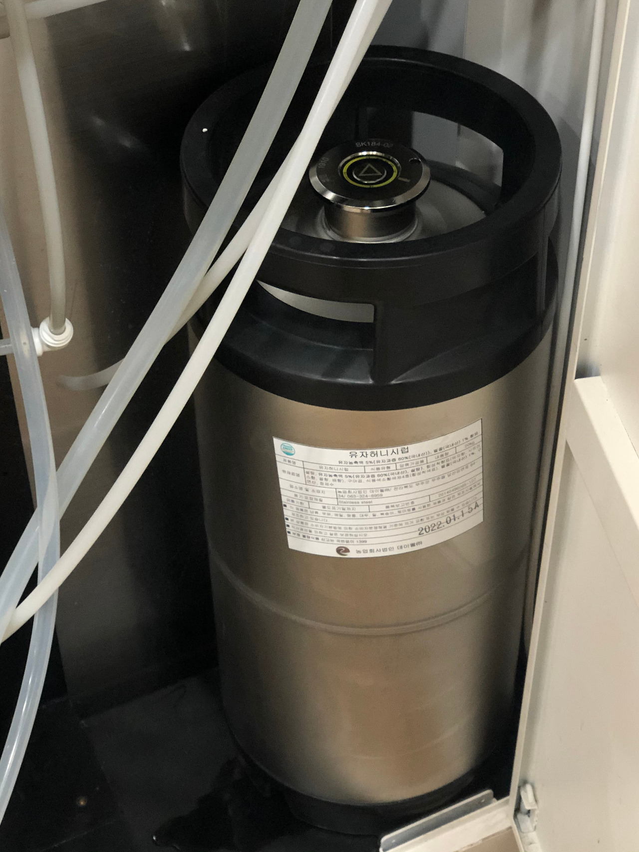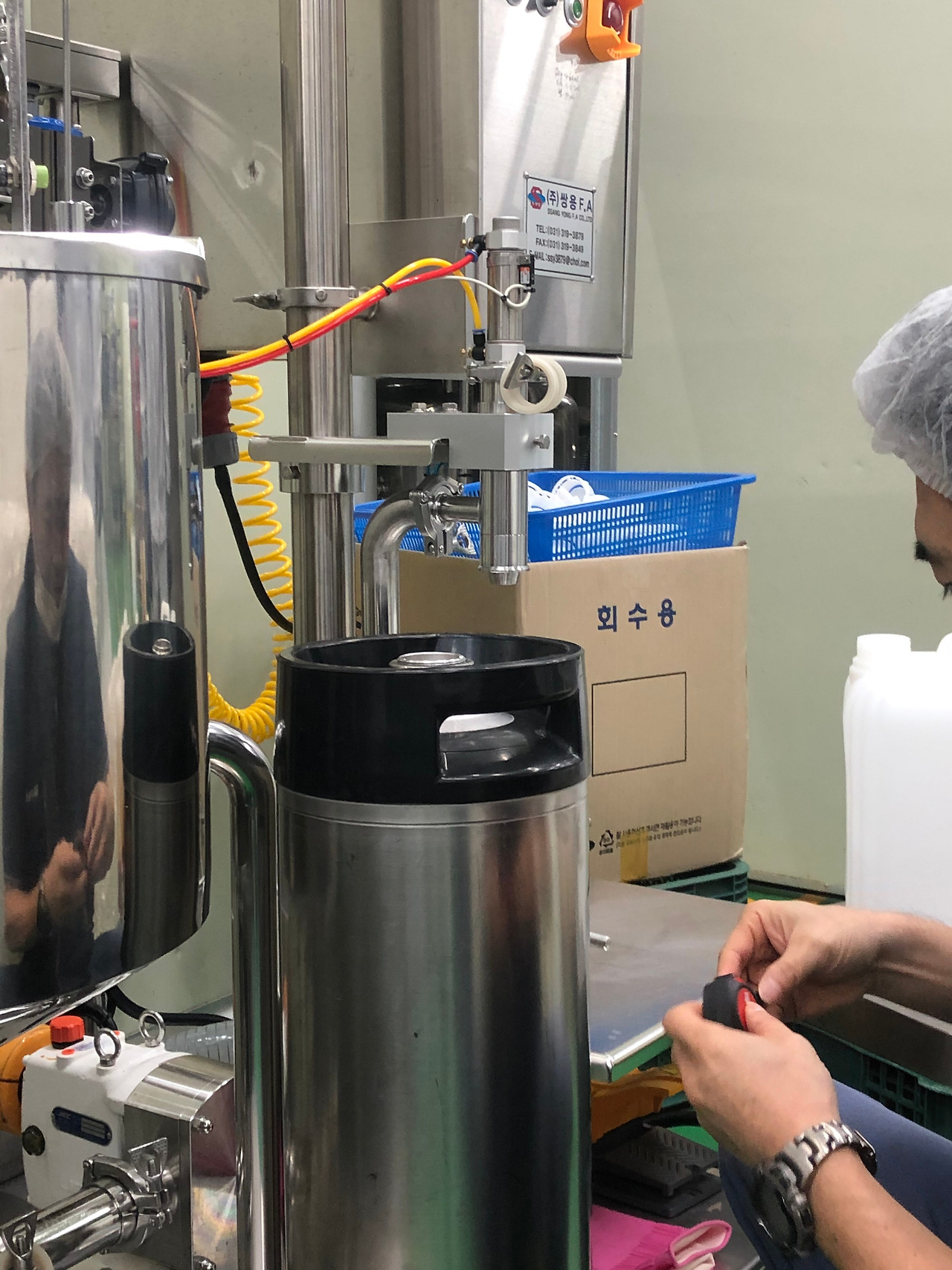 김유신 : Unmanned 비즈니스 모델을 선정했을 때부터 위생에 대한 촉각을 곤두세웠습니다. 기존 커피 자동판매기가 쌓아놓은 부정적인 인식과 더불어 콜드 브루 커피에 대한 위생문제가 대두되던 시점이었기 때문입니다. 플랜즈의 팀원들은 이러한 문제를 해결하기 위해 "케그 냉장 시스템"과 "자동 세척 시스템"을 개발에 착수합니다. "케그 냉장 시스템"은 주로 생맥주에서 사용하는 시스템으로써 커다란 스테인리스 용기에 가스 주입관과 음료 토출관을 결합할 수 있는 어댑터를 장착한 용기를 냉장한 상태로 음료를 상시 토출 할 수 있는 입니다. 케그 시스템은 음료를 뽑기 위한 음료 추출기를 용기에 결합해도 공기나 외부 오염 요인들이 유입되지 않고 음료만 토출 됩니다. 그 이유는 외부 공기가 밀폐된 상태에서 질소 혹은 탄산가스가 용기 내로 주입하여 뽑아낸 음료의 용량만큼을 채우는 "가스 치환 공법"을 응용되었기 때문이죠. 거기에 내부 음료들의 성상이 일괸될 수 있도록 냉장을 겸하면 음료를 뽑아내면서도 계속 위생상태를 유지할 수 있습니다.
