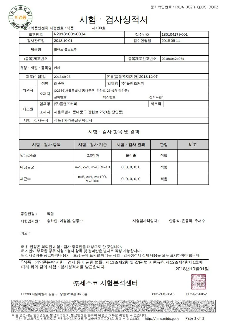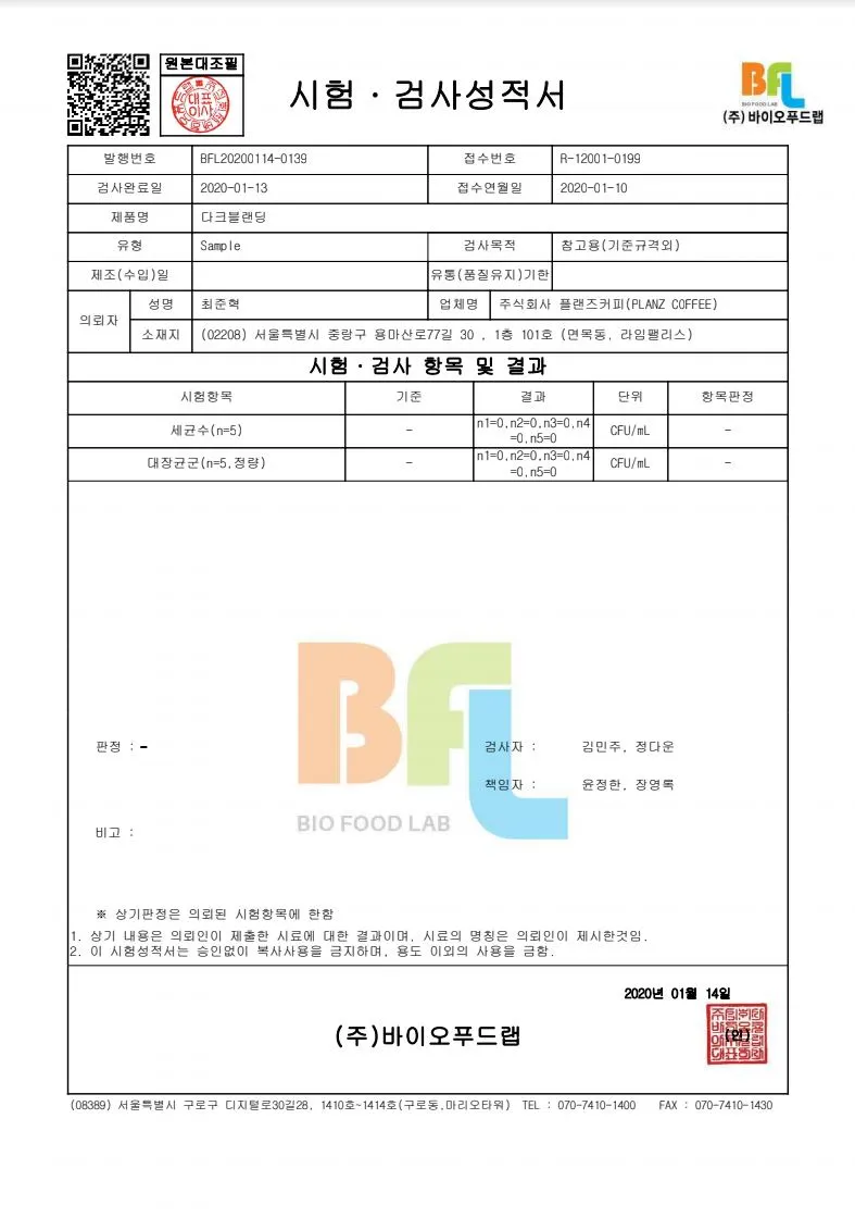 2019년 8월 플랜즈와 경희대학교 식품안전연구실은 플랜즈 서비스 위생 안정성에 대한 밸리데이션을 진행했습니다. 그 결과는 놀라웠습니다. 기기에 장착한 커피 탱크에서 3개월간 균이 검출되지 않았기 때문입니다.