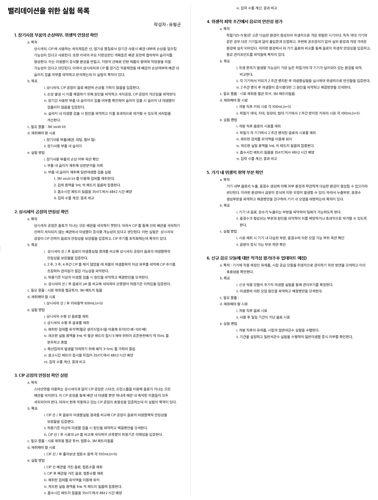 유형곤 : 또한 플랜즈는 1년 단위로 서비스 전체에 활용되는 프로덕트 및 프로세스에 대해서 위생 적격성 검사를 수행합니다. 그 목적은 각 부서별로 설정한 위생성이 과연 단기, 장기적으로 적합한지에 대한 대대적인 검수 과정입니다. 작년에는 경희대학교 식품안전연구실 윤기선 교수님 게 자문을 받아 해당 밸리데이션 과정을 설계했고 올해는 ISO 22000 인증 요소에 맞춰 밸리데이션 항목을 구성하여 실험과 적격성을 검증하고 있습니다. 기본적으로 식약처에서 매해 발행하는 식품공전과 식품법상 규격은 만족하지만 해당 기준이 모든 식품 산업에 적용하기에는 빈틈이 있기 마련이기에 좀 더 체계적인 기준을 바탕으로 검증이 필요합니다.