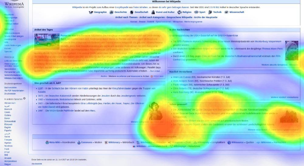 : 사용자가 어디를 가장 많이 보는지를 색으로 구분합니다. 빨간색의 경우 시선이 많이 머무르고, 초록색부터 색이 흐릴수록 시선이 덜 간다는 것이죠. 대부분의 웹사이트는 F형태로 내려갑니다. 이러한 사용자가 읽는 순서에 대한 연구는 닐슨 노먼의 연구에 의해 발표되었습니다.