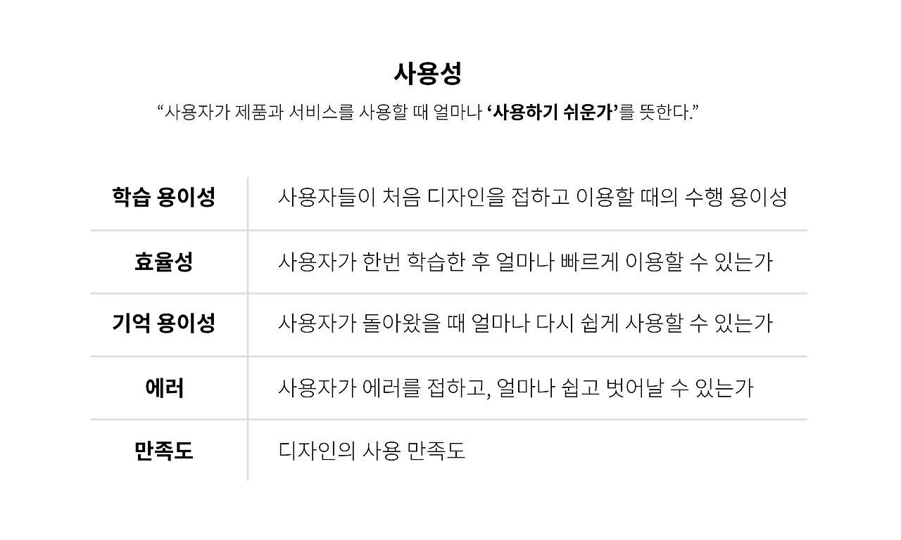 사용성이라는 것은 사용자가 제품이나 서비스를 사용할 때 얼마나 사용하기 쉬운가를 뜻하는데, 사용자와 서비스 제품 간에 일어나는 인터렉션에서 일어나는 사용의 품질을 의미합니다. 이러한 사용성을 닐슨은 아래의 그림과 같이 5개로 구분합니다.