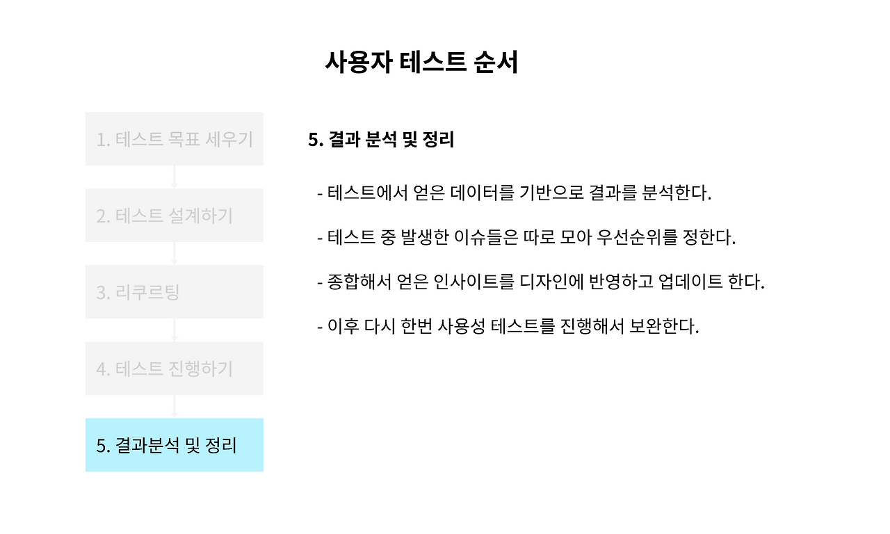 사용자 테스트의 이점은 프로젝트 초기에 문제점을 발견하고 수정하는 데 도움을 준다는 것입니다. 이를 통해 디자인 개발 프로세스에서 리소스를 효율적으로 사용할 수 있으며 사용자들의 니즈와 행동 패턴을 반영할 수 있죠. 또 이해관계자와 팀 구성원들을 설득할 수 있습니다. 이러한 사용성 테스트는 크게 5개의 순서로 구성되어있습니다.