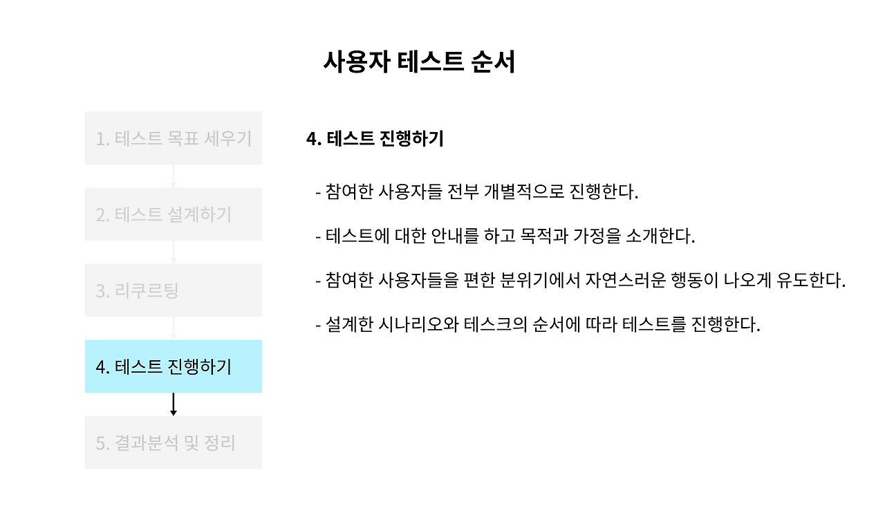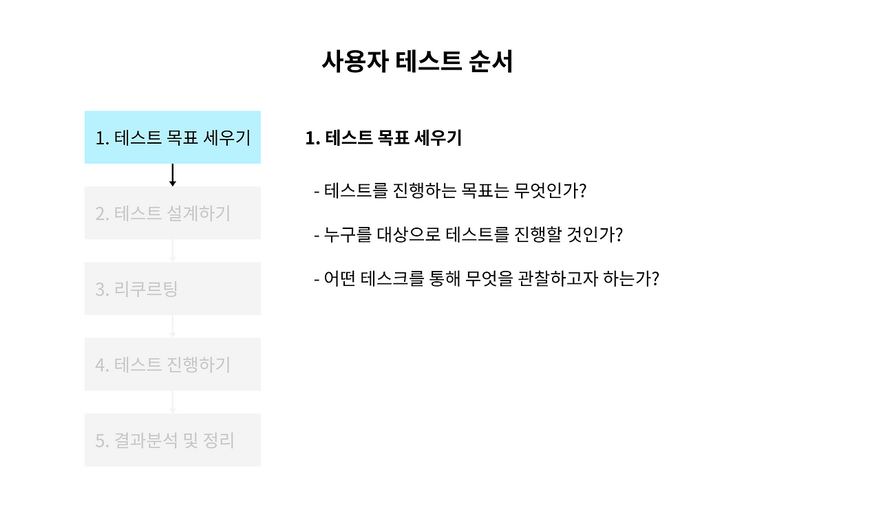 : 테스트를 진행하는 목표는 무엇인가? 누구를 대상으로 진행할 것인가? 테스트에 참여한 사용자에게 어떤 식으로 서비스를 설명할 것이고 어떤 테스트를 통해 무엇을 관찰하는지를 명확하게 할 것인지를 정해야 합니다.