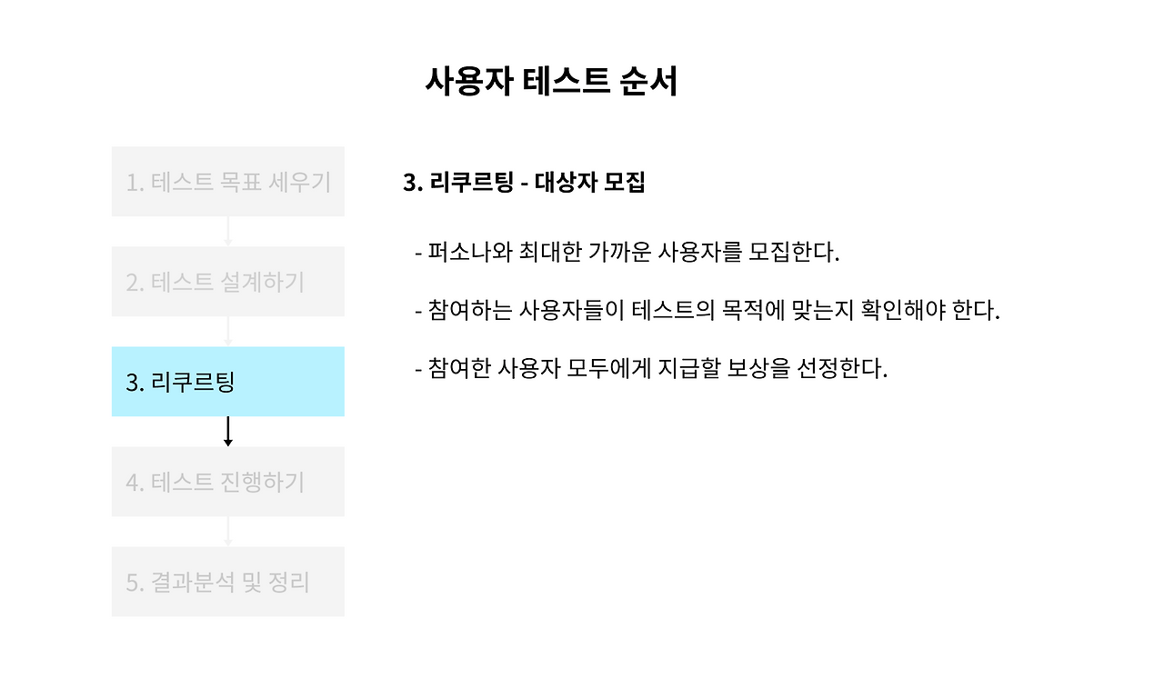 : 우리가 설정한 페르소나와 가까운 사용자를 모집해야 결과가 정확하고 그렇게 해야만 서비스를 만든 우리들의 의도가 맞는지 아닌지 판단할 수 있습니다. 모집된 참여자들이 테스트 목적에 부합하는지를 확인하고 지급 보상을 산정하는데 일반적으로 3 ~ 5만 원 최대 10만 원을 정합니다.