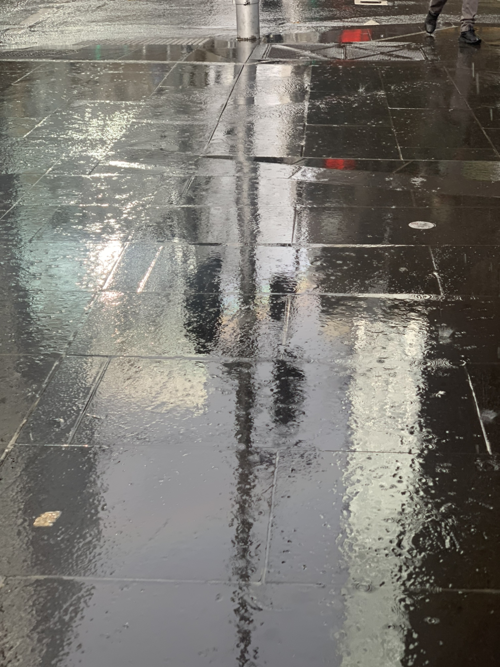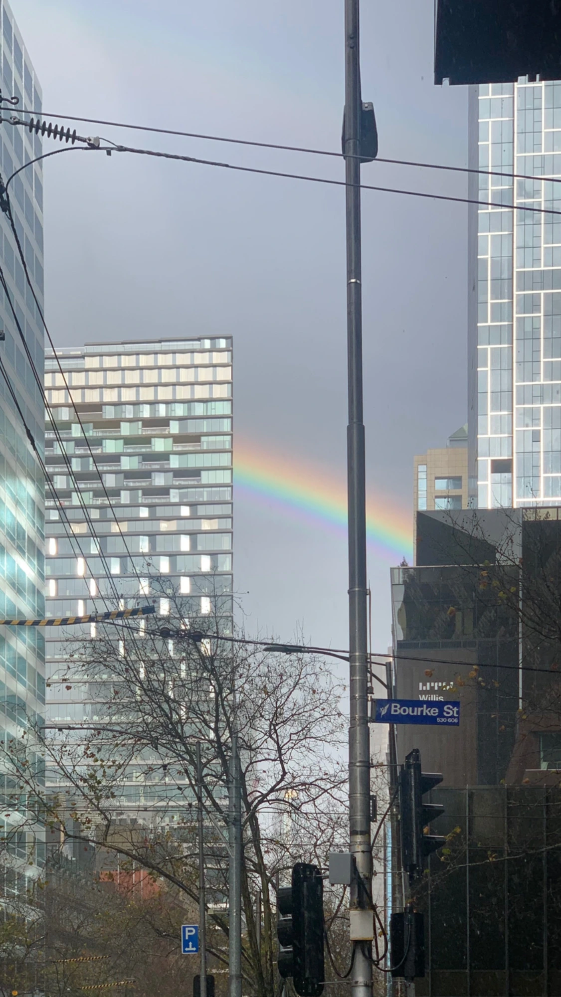 필요한 청소용품과 텅 빈 냉장고를 채울 음식을 사러 마트로 가고 있었다. 아파트에 나와 신호등으로 향하는 길에 바닥에서 무지개를 봤다. 고개를 올려, 하늘을 보니까 빌딩 사이로 진한 무지개가 떠 있었다. 행복하지 않을 수 없을 거 같았다.