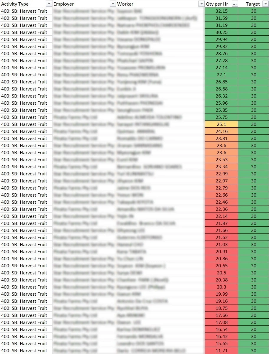 어김없이 온갖 경고를 받으며 라즈베리를 따고 있을 때였다. 하루가 끝나면, 리스트가 올라왔는데 색깔에 따라 자신의 위치를 한눈에 볼 수 있었다. 가장 좋은 건 진한 초록색, 그 밑으로 초록색이 점점 연해진다. 연두색, 노란색, 주황색, 빨간색. 빨간색! 이 빨간색이 제일 문제다. 빨간색이 지속되면 가차 없이 잘린다.