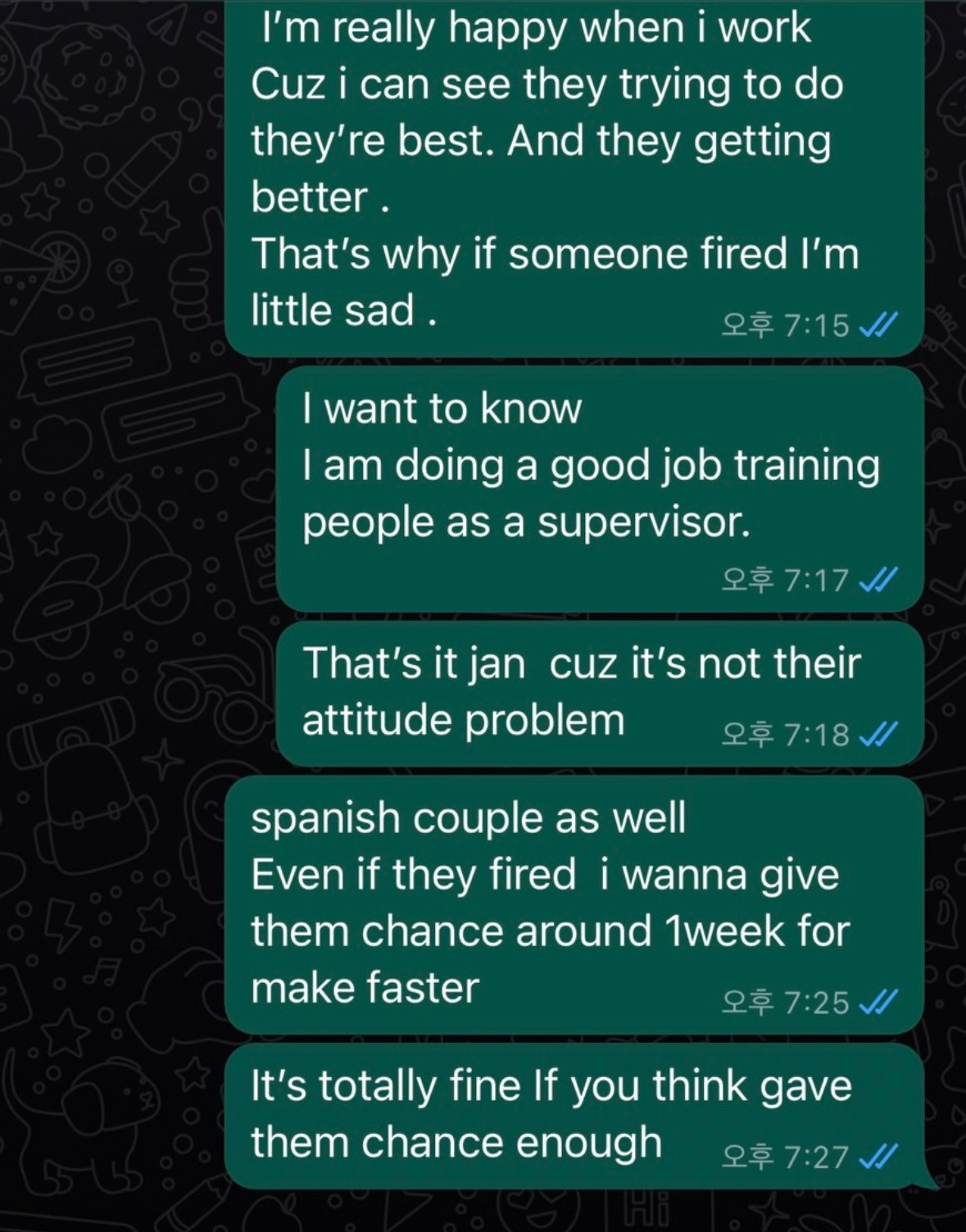 숙소로 돌아와 씻고 나왔는데, 왠지 시호의 표정이 좋지 않았다. 리오가 새로운 그룹 톡 방을 만들었다고 한다. 나와 시호를 포함해, 몇 워커들이 초대되어 있었다. 리오는 농장 매니저에게 연락을 받았다. 이번 주 중으로 이 워커들을 전부 정리해줬으면 한다는 연락. 그 워커들이 바로 우리다. 이번 주라니. 일을 시작한 지 일주일도 안 됐는데, 벌써 잘린다고?
