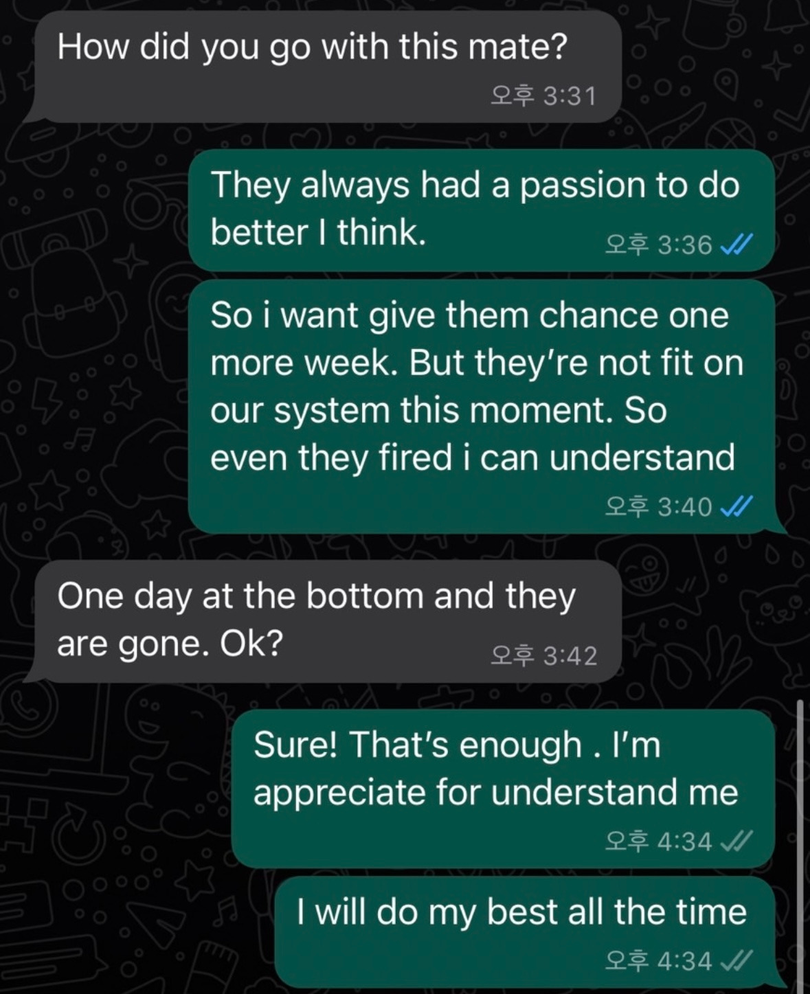 ‘그들은 들어온 지 얼마 되지 않았어요. 며칠만 기회를 더 준다면 충분히 성장할 가능성이 있어요.’ 우리는 들어온 지 3일 만에, 찬스까지 써 버렸다. 그룹 톡 방의 연락을 끝으로 리오에게서 전화가 왔다.