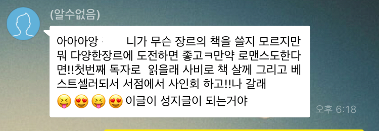 “나는 진짜 네 글 너무 기대돼. 나한테도 꼭 읽을 수 있는 기회를 줘.”