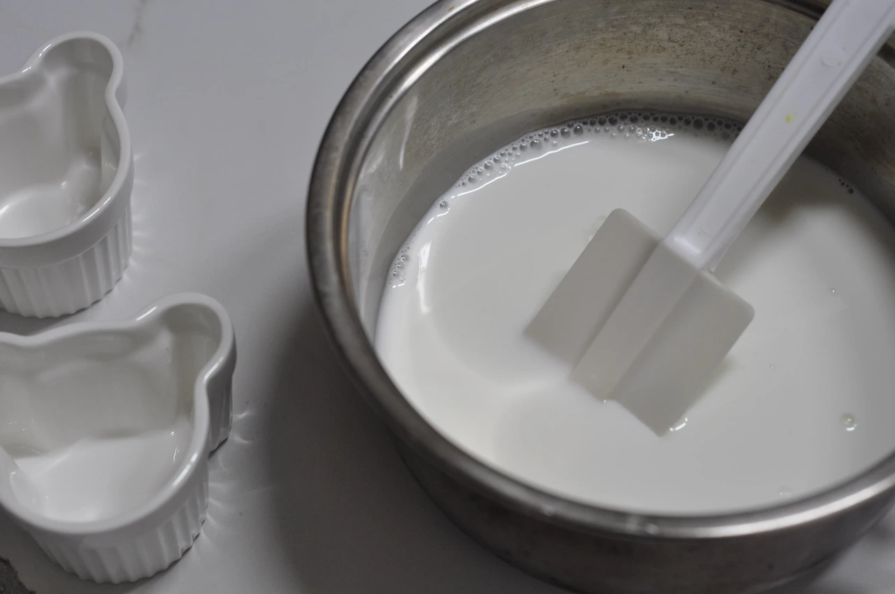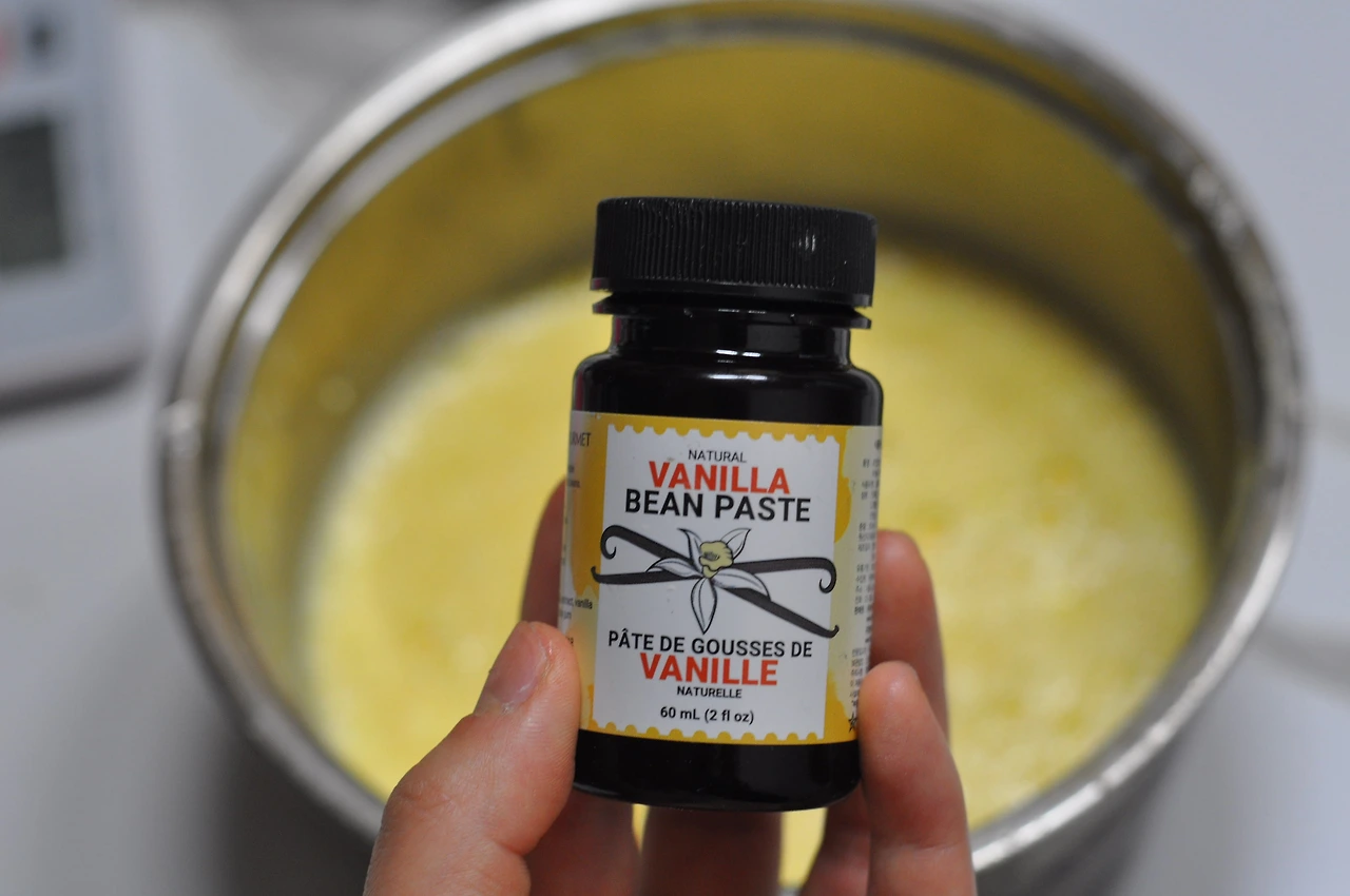 2. 냄비에 흰 우유, 바나나우유, 달걀노른자, 바닐라빈 페이스트, 체 친 박력분, 소금을 넣고