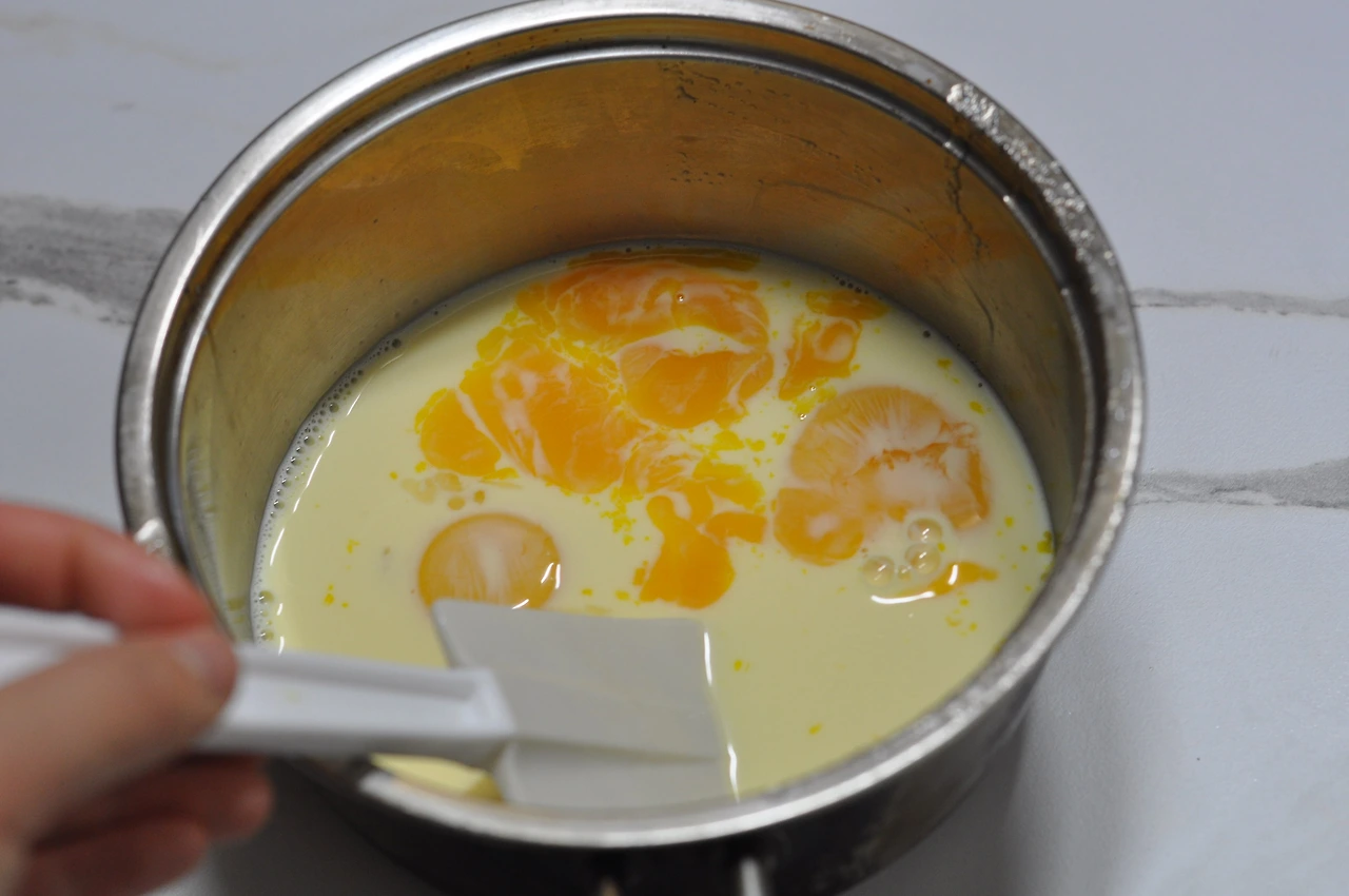 이때 충분히 섞어주지 않으면 크림 브륄레 반죽이 익을 수 있으니 골고루 섞어준다.