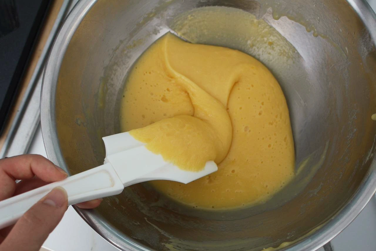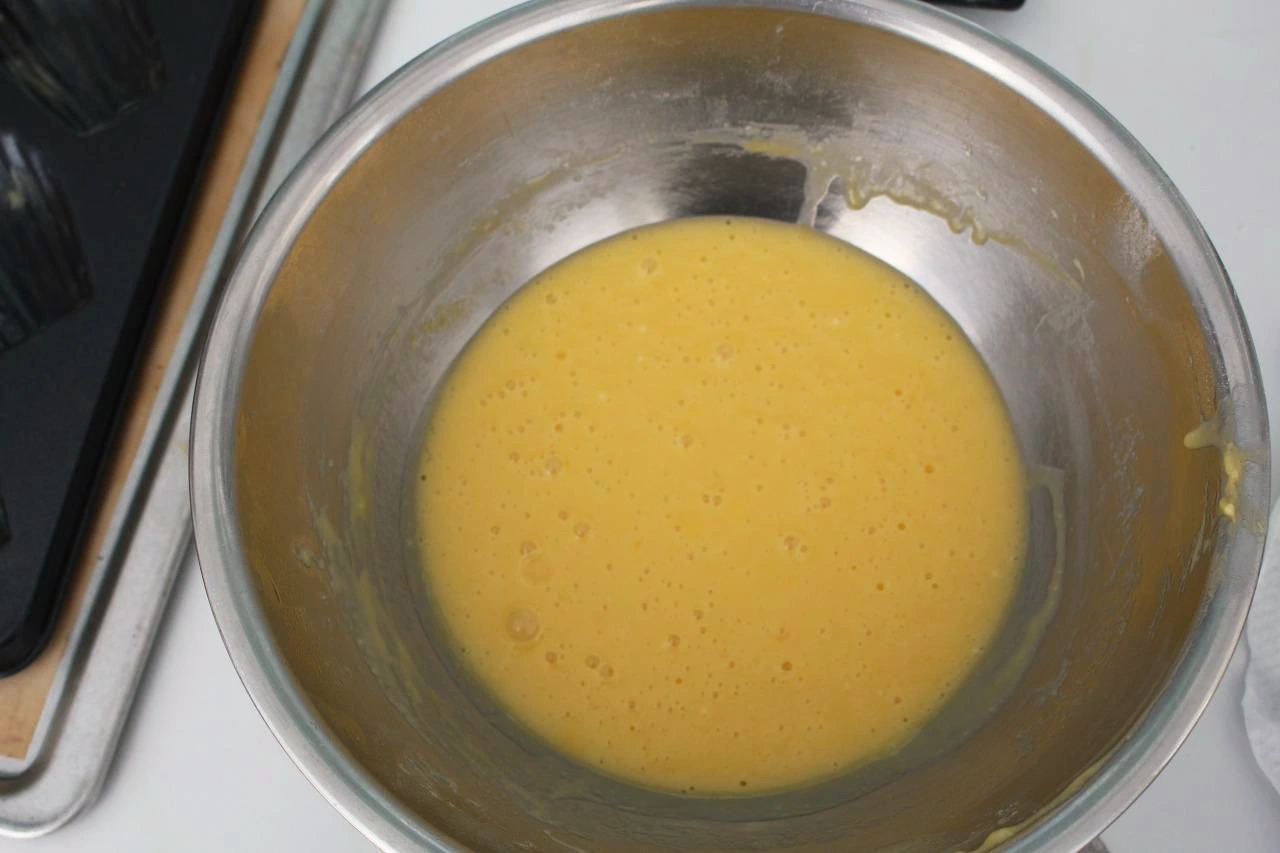 7. 휴지가 끝난 마들렌 반죽은 주걱으로 한번 섞어 팬닝 해준다.