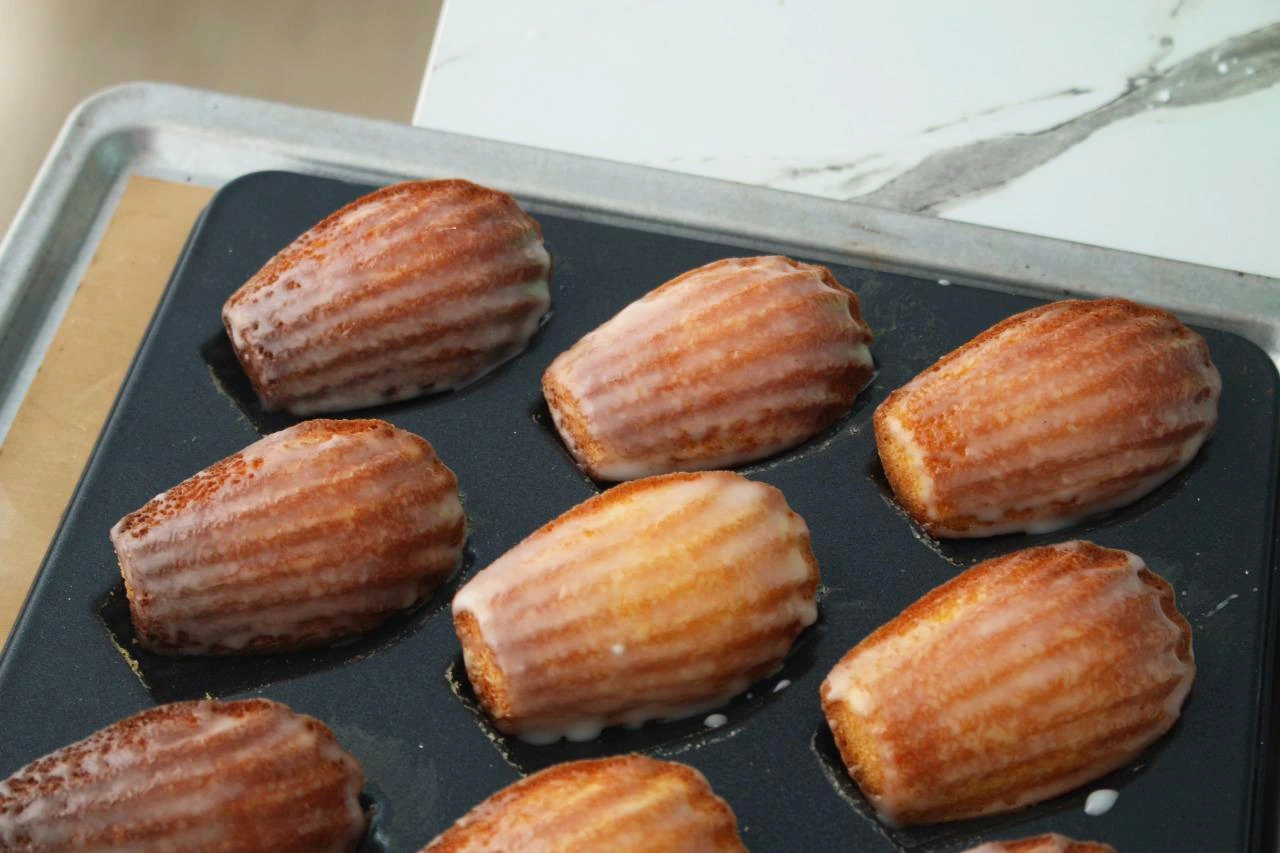 다 구워진 유자 마들렌 위에 유자 글라쎄를 발랐는데 신맛을 좋아하는 사람이라면 유자 글라쎄 대신