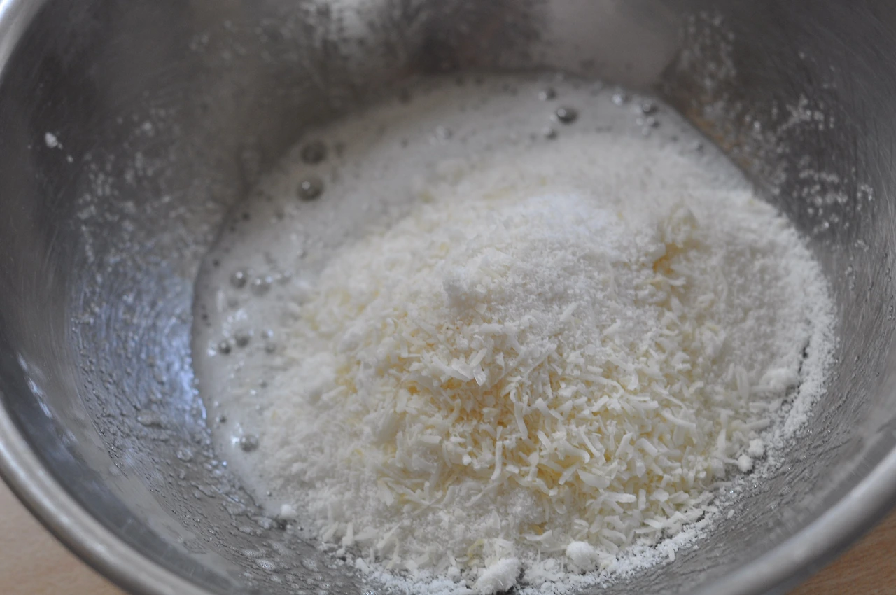 흰자에 코코넛가루, 코코넛 슬라이스를 넣어
