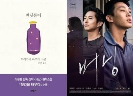 ‘버닝’은 무라카미 하루키의 소설을 원작으로 하고 있는 작품으로 이창동 감독이 7년만에 새롭게 내놓은 작품이다. 영화와 원작소설의 차이점을 살펴보면 우선 영화 속 캐릭터의 설정이 변화되었다. 유아인의 ‘종수’ 역할이 소설 속에서는 유부남이라는 설정이었지만 영화 속에서는 ‘소설을 쓰는 청년’ 이라는 캐릭터로 변화되었다. ‘종수’를 ‘청년’ 이라는 캐릭터로 설정 함으로써 청년실업, 금수저 등 한국 사회의 다양한 문제들을 다루고자 했던 것으로 분석된다. 또한 소설 속의 중요한 소재인 ‘헛간’이 영화에서는 ‘비닐하우스’로 변화하였는데 일본이라는 소설 배경에서 ‘한국’이라는 배경으로 변화시키다 보니 전환된 요소들이라고 분석된다. 이창동 감독만의 영화로 재탄생 한 ‘버닝’은 소설안의 디테일한 부분들은 많이 달라졌지만 그 이외의 줄거리의 큰 틀은 크게 달라지지는 않았다.