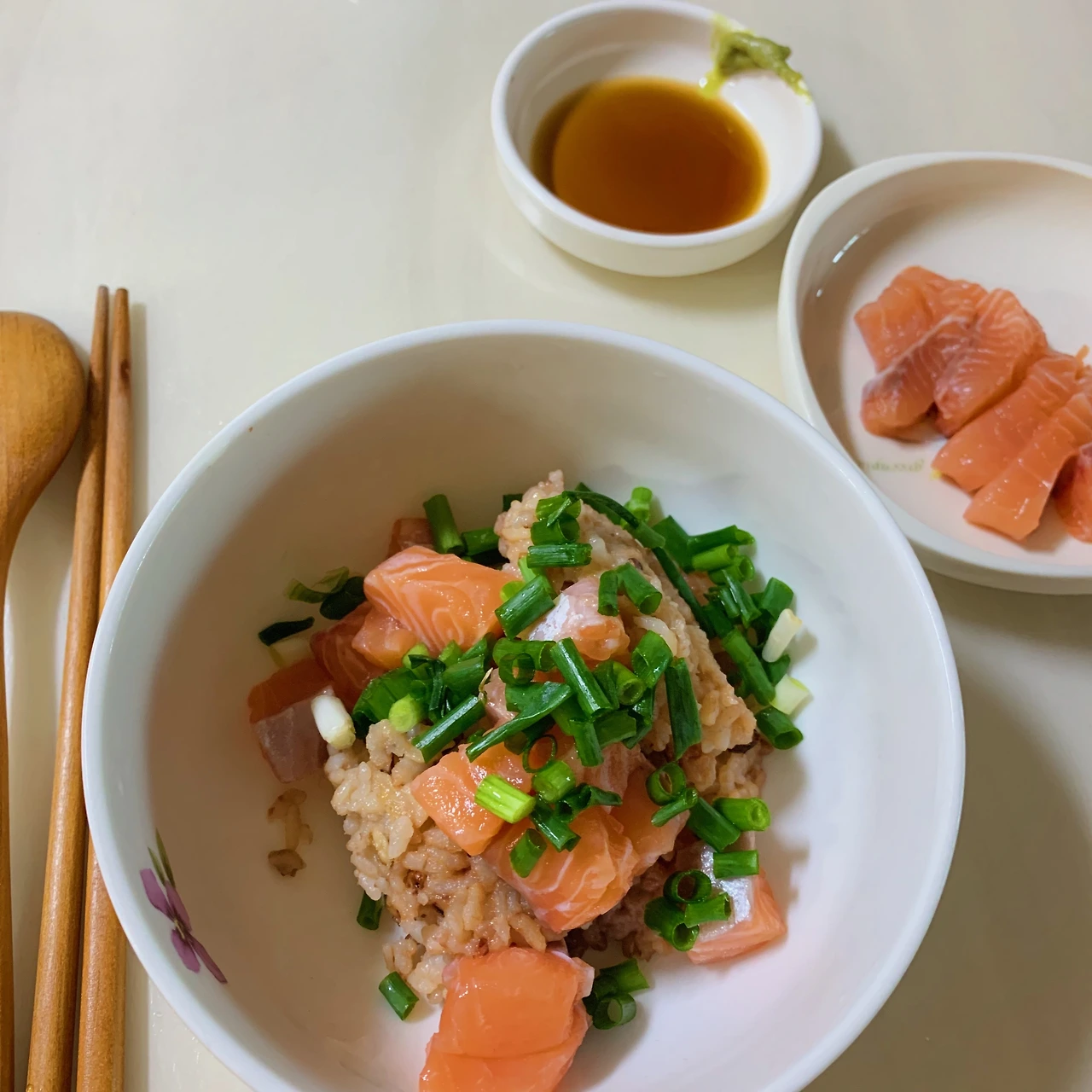 처음에는 구이용 연어여서 구워 먹어 봤더니 생각보다 기름이 많이 나와 제대로 굽는 것도, 혼자 다 먹는 것도 힘들었다. 살점은 부드럽고 먹기 좋았지만. 두 번째 생연어는 반은 잘라서 랩에 씌어 냉동실에 두었고 나머지 절반은 요리해 먹었다. 3분의 1은 칼로 숭덩숭덩 썰어 회처럼 간장에 찍어 먹고, 나머지는 큐브처럼 작고 네모지게 잘라 밥 위에 올려 허전하지만 그런대로 덮밥으로 먹었다. 짜지 않은 적당한 소스와 무순 몇 가닥이 올라가 있어야 그럴싸한 사케동이 되겠지만, 완성도보다는 맛과 시도 자체를 더 중요하게 생각하는 나는 간장에 설탕을 섞어 데리야끼 소스와 비슷한 맛을 내고 느끼하지 않게 파를 송송 썰어 올렸다.