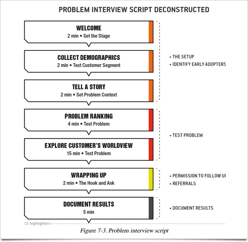 Problem Interview는 고객이 경험하는 '문제'에 집중합니다. 그래서 인터뷰 질문들은 문제 정의, 문제해결을 위해 선택한 기존 대안재, 고객 세그먼트 파악에 관한 내용으로 구성되어 있습니다. 인터뷰 구성을 자세히 보면 다음과 같습니다.