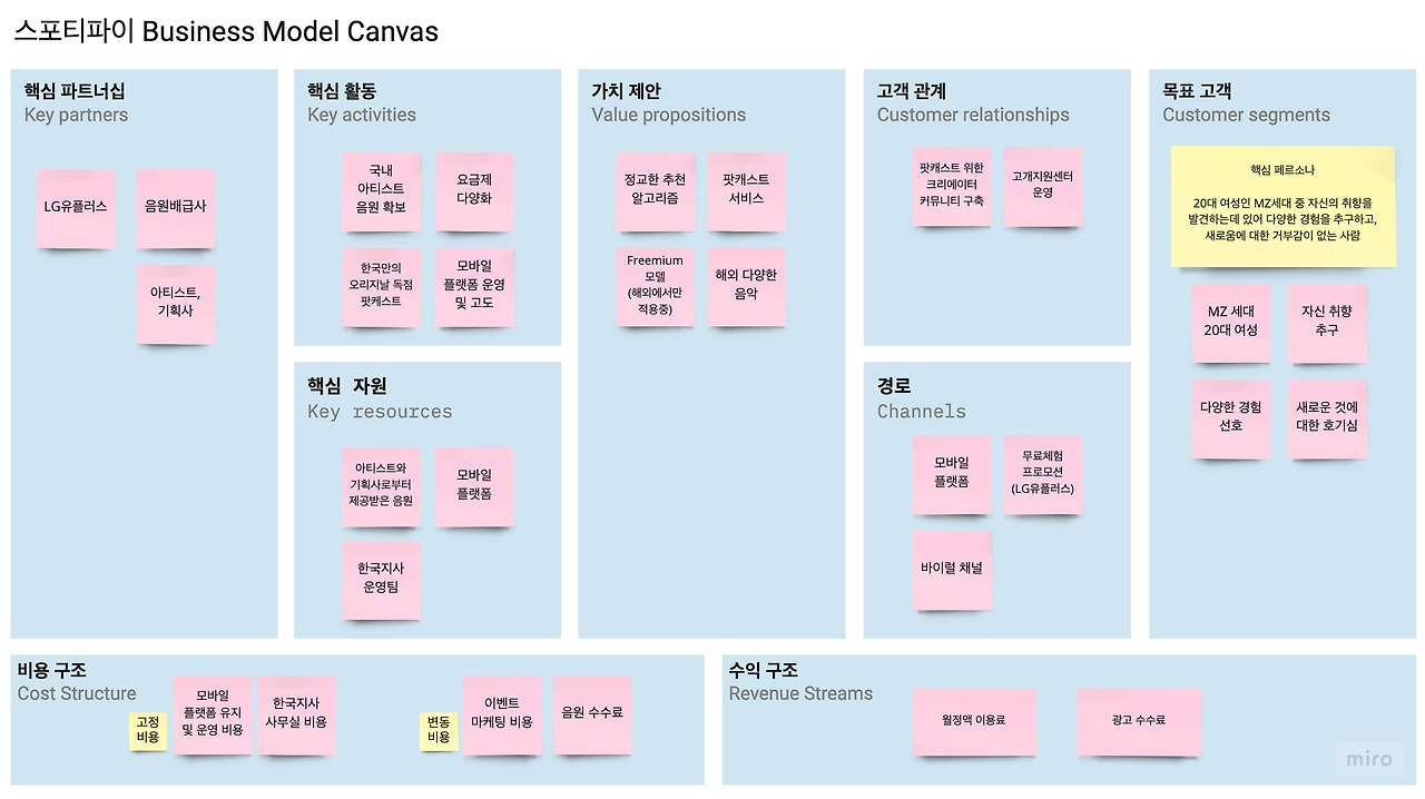 지금까지 분석해본 스포티파이의 비즈니스 모델을 아래 캔버스에 정리했습니다.