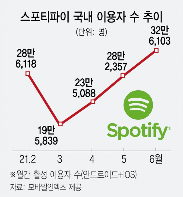 또한 스포티파이는 론칭 직후 기대했던 만큼의 이용자 확보를 달성하지 못하였지만, 그 뒤로 꾸준히 한국 이용자를 확보해왔습니다. 빅데이터 분석 서비스인 모바일인덱스의 21년 7월 5일 발표자료에 따르면 3월 이후부터 꾸준히 이용자 수가 증가했는데 이용자의 60% 이상이 29세 미만의 연령대였으며, 성비는 여성이 57.43%로 남성보다 많았습니다.