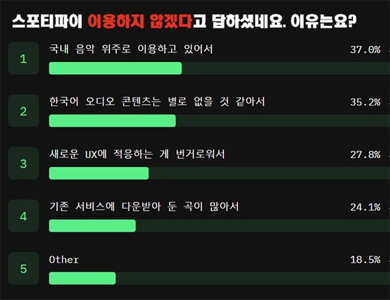 먼저, 국내 데이터를 보도록 하겠습니다. 아래 자료들은 스포티파이 론칭 이전와 론칭 이후 시장조사입니다. 스포티파이에 대한 인식과 이용자 변화를 알아본 자료입니다.