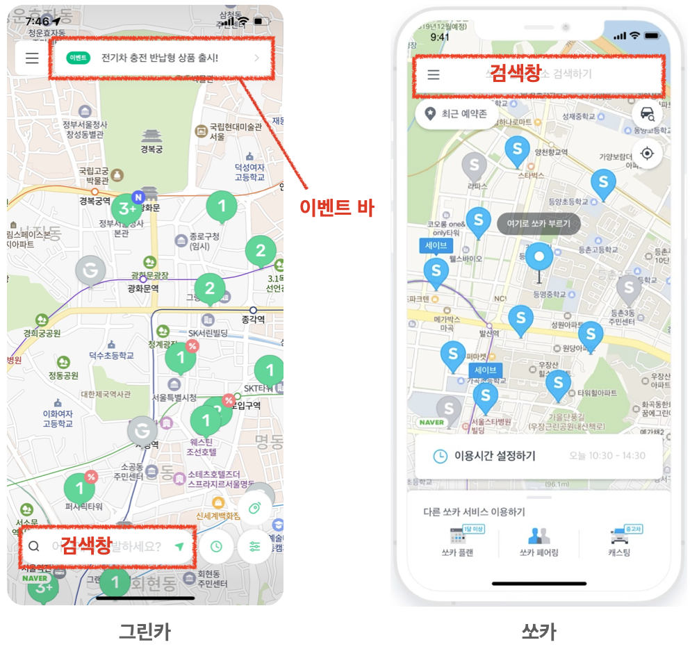 1. 지도 검색(그림1-1,1-2)은 맨 처음 앱에 접속하면 예약을 위해 행하는 첫 번째 행위입니다. 차량을 이용하기 위한 가장 핵심적 활동이며 시간적으로도 가장 빠른 단계입니다. 하지만 검색창 자체를 발견하기 위해 노력(?)해야 한다면 불편하고 짜증이 날 수 있습니다. 제게 가장 먼저 눈에 띄는 건 메뉴 옆에 있는 이벤트 바였습니다. 습관처럼 이벤트바를 검색창인 줄 알고 클릭했고, 원하지 않는 페이지로 이동했었습니다. 반면에 쏘카는 직관적으로 검색을 어디서 해야할지 눈에 띄었습니다. 이러한 차이는 서비스에 대한 첫 인상을 좌우하기 때문에 중요합니다.