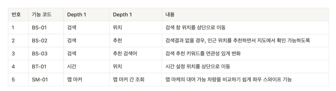 프로토타입에서 설명한 내용을 정리하면 다음과 같습니다. [그림4] 기능 정의서는 기획한 내용을 개발자와 소통하는데 활용됩니다.