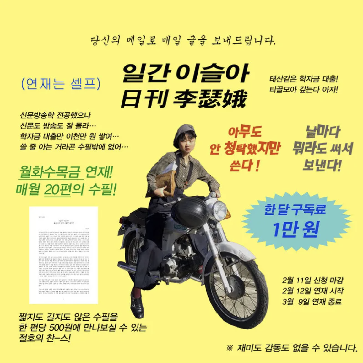 무언가 포스가 느껴지는 포스터. 투박한 글씨체와 쨍한 색. 바이크 위 그녀의 칙칙한 체크무늬 셔츠와 멜빵바지. 험상궂은 표정이 구독 안 하면 강매해 버릴 것 같다. 겨드랑이에 끼고 있는 것은 신문인 것 같은데, 신문 배달하듯 수필을 배달해 준다는 의미이겠지. 배달하면 떠오르는 바이크는, 흔히 중국집 배달이나 우체국 오토바이로 쓰이는 슈퍼커브 같은 언더본 바이크다. 하지만 그녀는 네이키드 바이크에 앉아있다. 저렇게 생긴 네이키드 바이크를 타고 배달하는 라이더를 본 적이 있는가? 우체국 아저씨를 본 적이 있는가? 그렇게 생각하면 뭔가 범상치 않은 기운이 느껴진다. 세련된 것과는 거리가 멀지만, 멋있다. 글도 그럴 것 같다. 그럴 의도였는지, 아니면 그녀가 쓸 수 있는 유일한 소품이 저 바이크였는지는 모르겠지만.