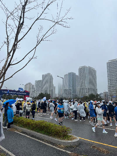 4월 말, ‘영종도 선셋 마라톤’은 남자친구와 함께 참가했다. 축제처럼 꾸며진 대회였고 마라톤 후에는 가수 공연도 예정되어 있어 기대가 컸다. 하지만 대회 당일에는 비가 쏟아졌고 표지판이 잘 표시되지 않아서 달리는 도중에도 길을 헤매는 참가자가 많았다. 완주 후 메달을 받기 위해 오랜 시간 줄을 서야 했던 점도 아쉬움으로 남았다. 전반적으로 비 오는 날씨는 대회의 분위기를 무겁게 만들었다. 운동화 속까지 스며든 물기와 축축해진 옷의 감촉도 몸을 지치게 했다. 혼자 참여 했다면 짜증이 먼저 올라왔을지도 모른다.