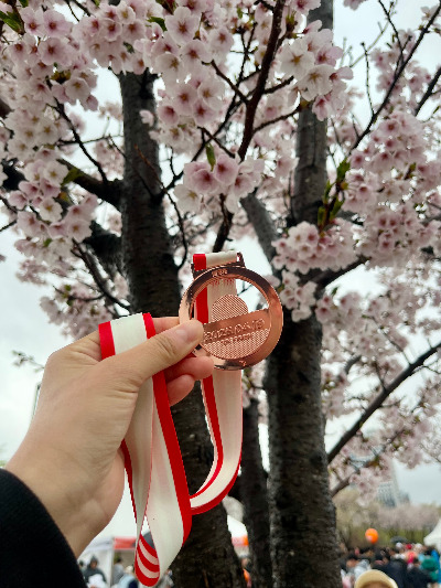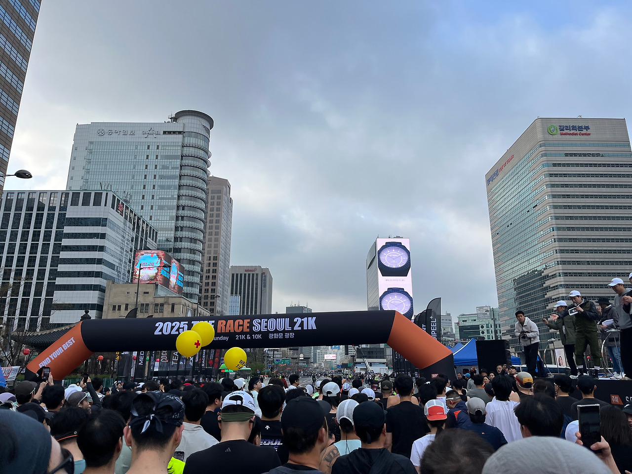 대회 당일이 되어 이른 아침에 알람을 듣고 잘 일어난 후, 피곤한 눈을 비비적거리며 대회장에 도착했다. 축제 분위기가 한껏 느껴지는 대회장에 도착하여 신이 났다. 하지만 크루별로 참가한 사람들 사이에서 유독 조용한 내 모습이 낯설게 느껴졌다. 혼자 뛰는 것이 익숙하다고 생각했지만, 누군가의 온기가 그리웠다. 대회에 종종 혼자 참가하는 것은 나를 단단하게 만들었지만, 동시에 어딘가 허전한 감정도 남겼다. 게다가 이번 대회 준비는 순탄하지 않았다. 2월 ‘챌린지 레이스’ 이후 야근이 이어졌고, 무리한 운동 탓에 허벅지 통증이 생겨 몇 주간 훈련을 쉬었다. 대회 일정조차 잊고 지냈고 배번표를 받고 나서야 “맞다, 대회가 있었지” 하고 떠올렸을 정도였다.