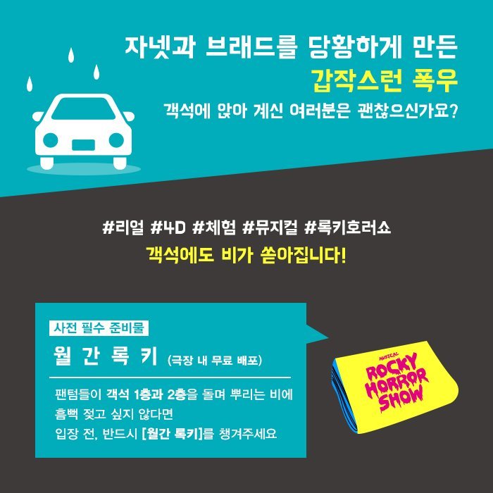 뮤지컬 ‘록키호러쇼’가 2017년, 무려 9년만에 한국 무대에 다시 오른 후 잊을만하면 한번 더 한국무대를 찾아와주고 있다. 필자는 고등학생때 미국 뮤지컬드라마 '글리(Glee)'의 엄청난 팬이었다. 매일매일 글리를 정주행하던 그 시절, 어떤 에피소드 전체가 처음 보는 뮤지컬인 '록키호러쇼'에 대한 내용이었다. 화려한 분장과 귀를 사로잡는 넘버들에 매료되 나는 바로 '록키호러쇼'에 대해 찾아보기 시작했고, 그 길로 바로 록키호러쇼의 덕후에 길로 들어섰다. 그 이후로는 영화와 넘버를 수없이 보고 들으며 한국 공연이 다시 돌아오기를 목을 빼고 기다리고 있었고, 마침내 재공연의 소식을 듣게 된 후, 망설이지 않고 바로 공연을 예매했다.