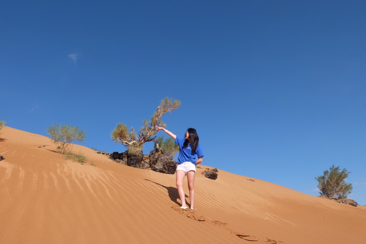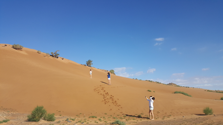 푸르공을 타고 고비 사막의 북쪽으로 한참을 달렸다. 그러자 어느새 또 다른 느낌의 사막에 당도해있었다. 노오란 빛깔의 모래사막과 파란 하늘의 조화는 실로 아름다웠다. 이것 또한 몽골이 가진 매력의 다양한 색채 중 하나일까. 서걱서걱한 질감의 모래를 힘차게 밟아가며 언덕을 향해 오르고, 또 올랐다. 홍고린 엘스와는 달리 이 사막은 질퍽하고 좀 더 굵은 모래를 가지고 있었다.